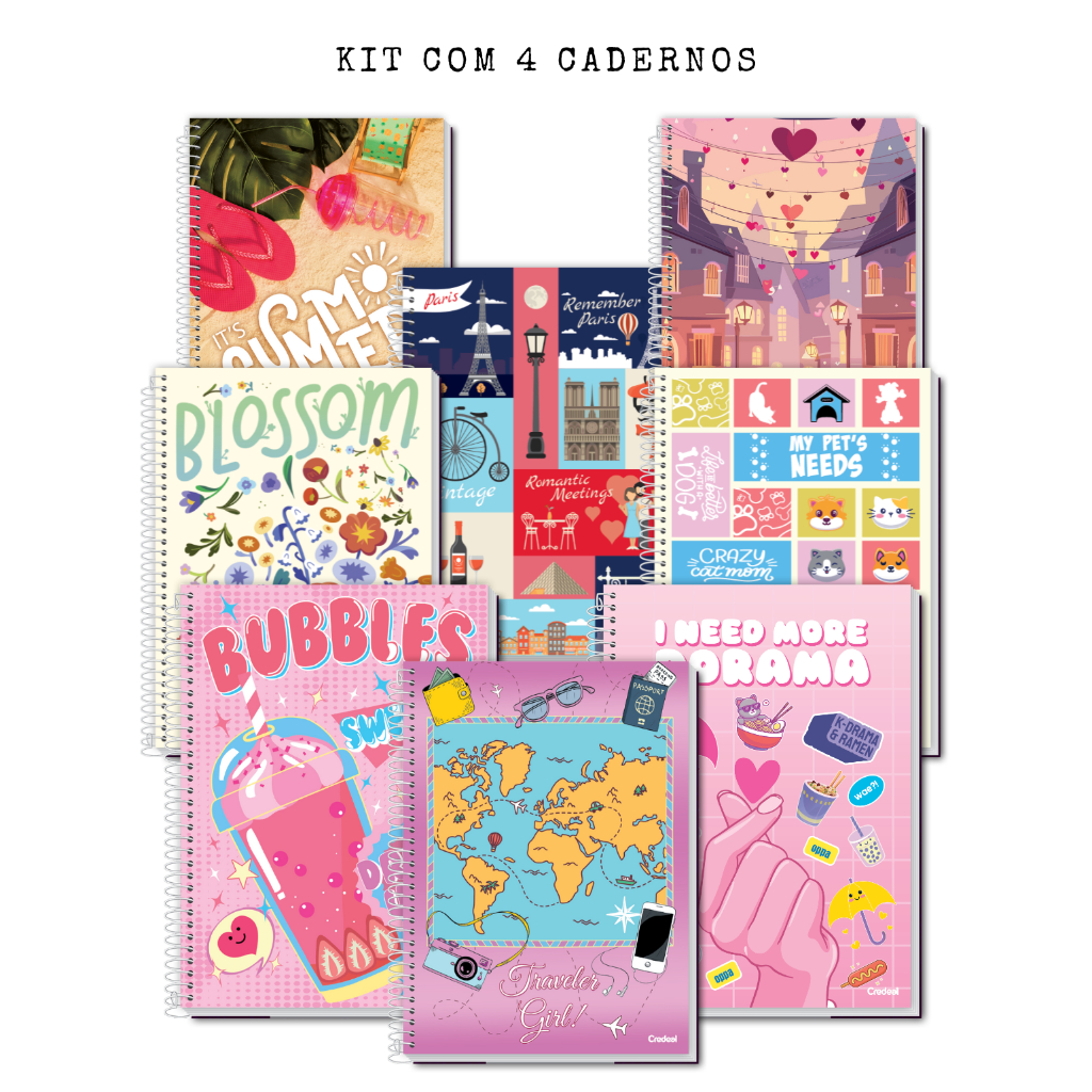 4 Unid Caderno Universitário Credeal My Collection 10 Materia 140 Folhas FEMININO