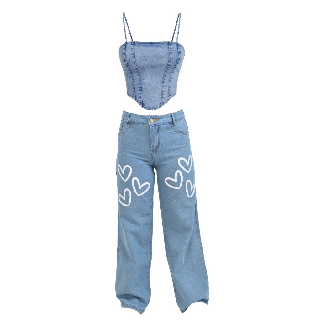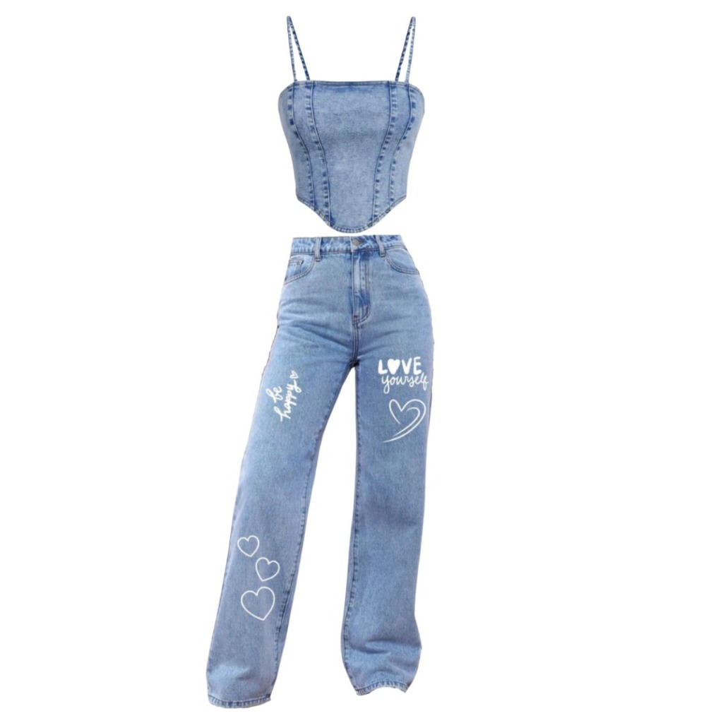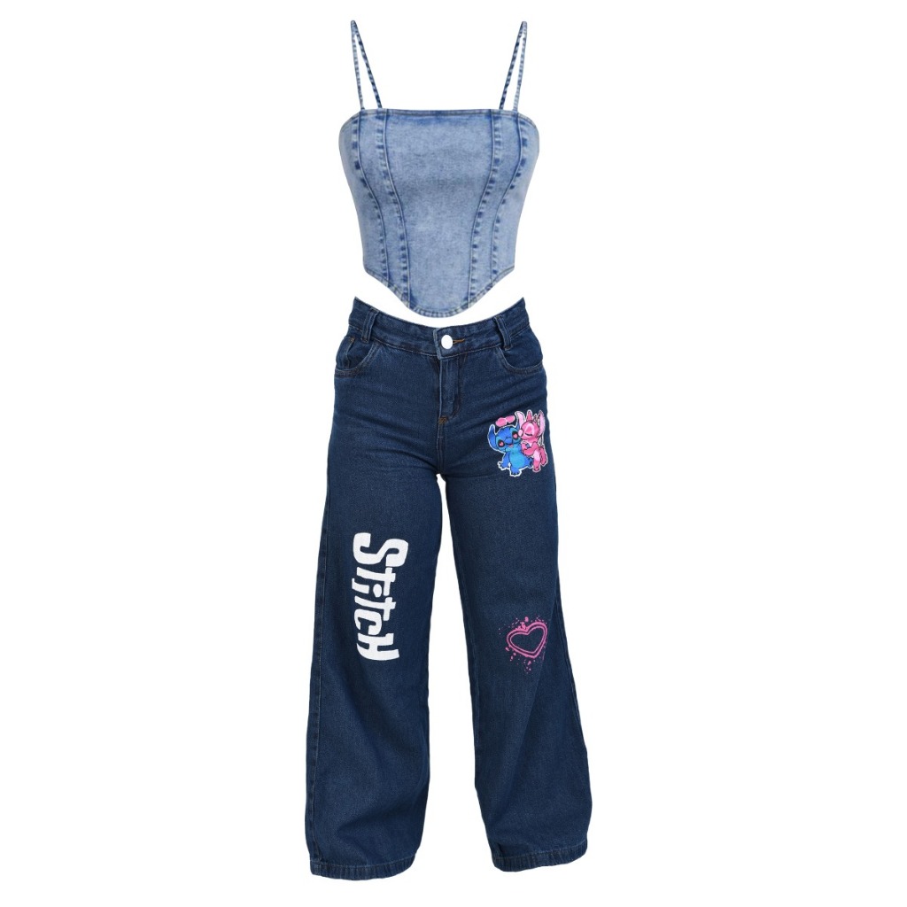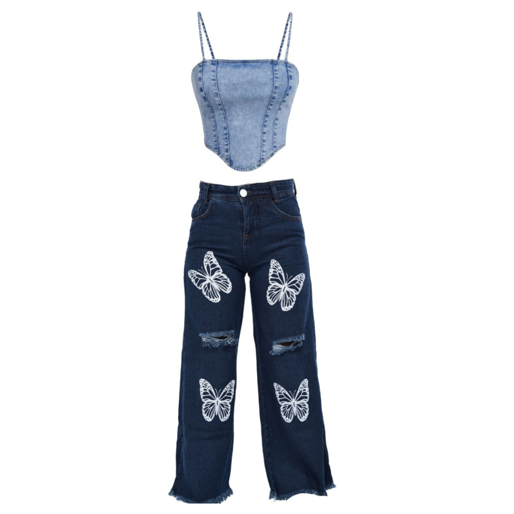 Conjunto Jeans infantil juvenil menina calça wide leg + cropped jeans