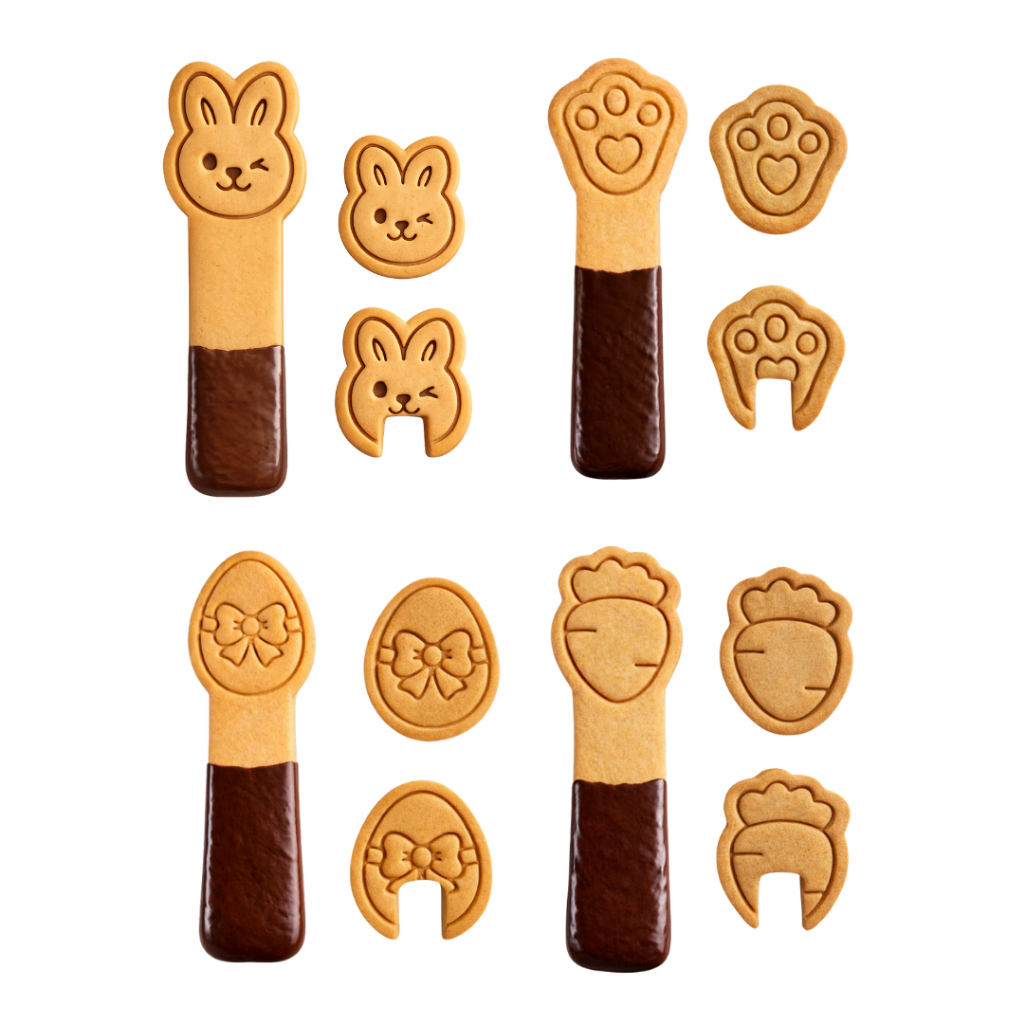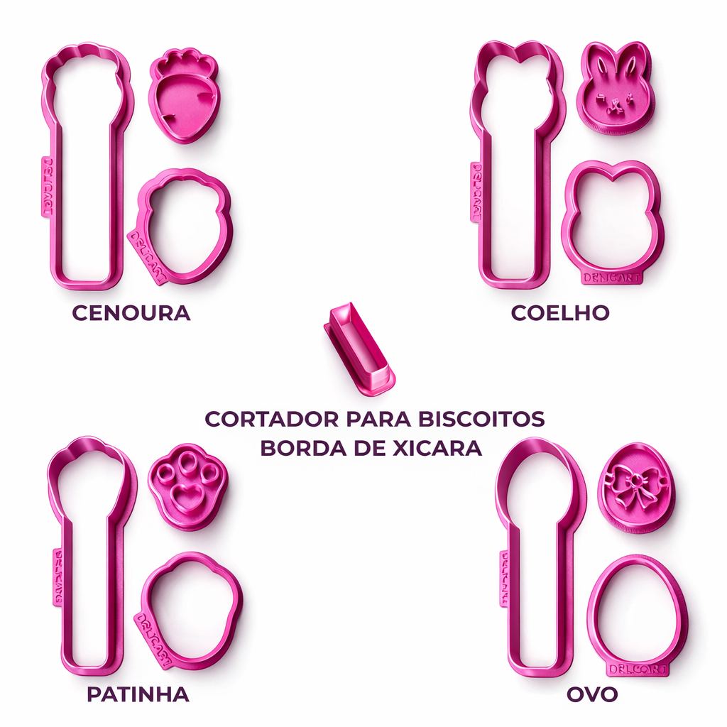 Kit Profissional 4 Cortadores e Carimbos 3 em 1 Páscoa Palito Tradicional Borda de Xícara 4cm e 10cm