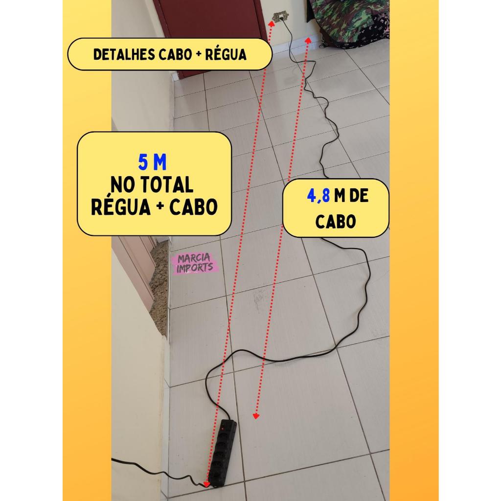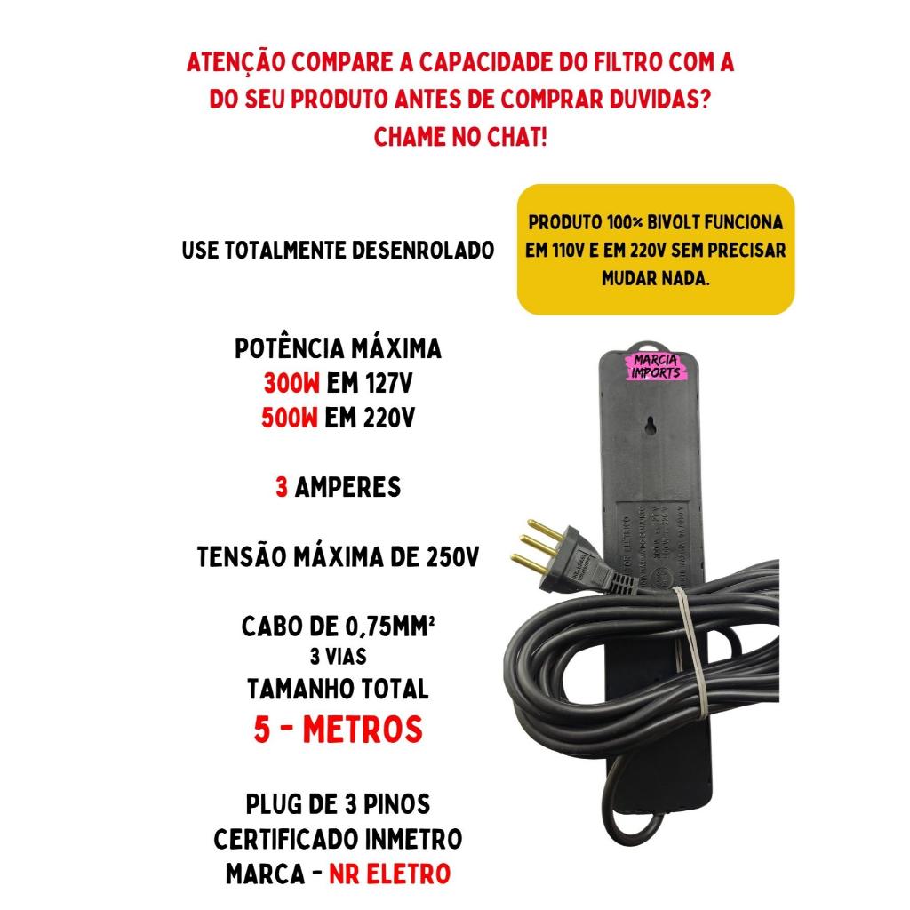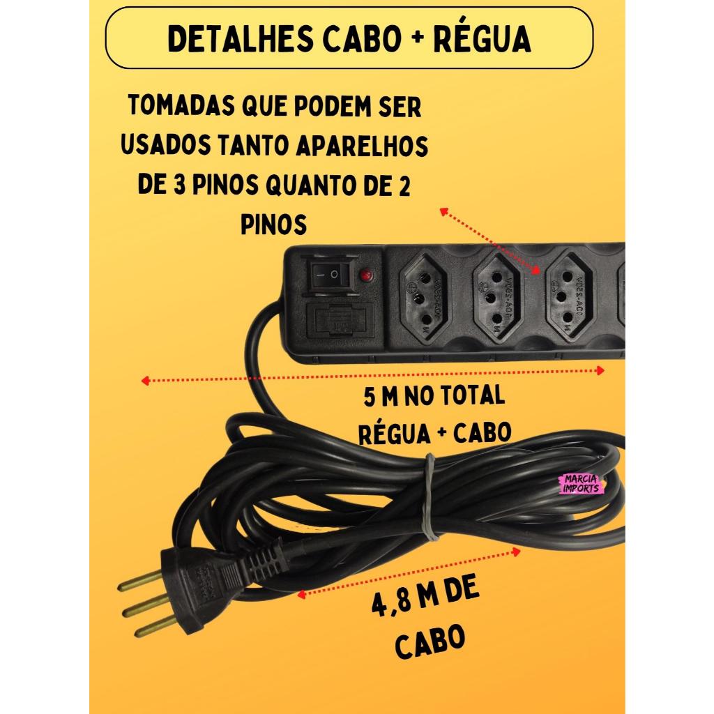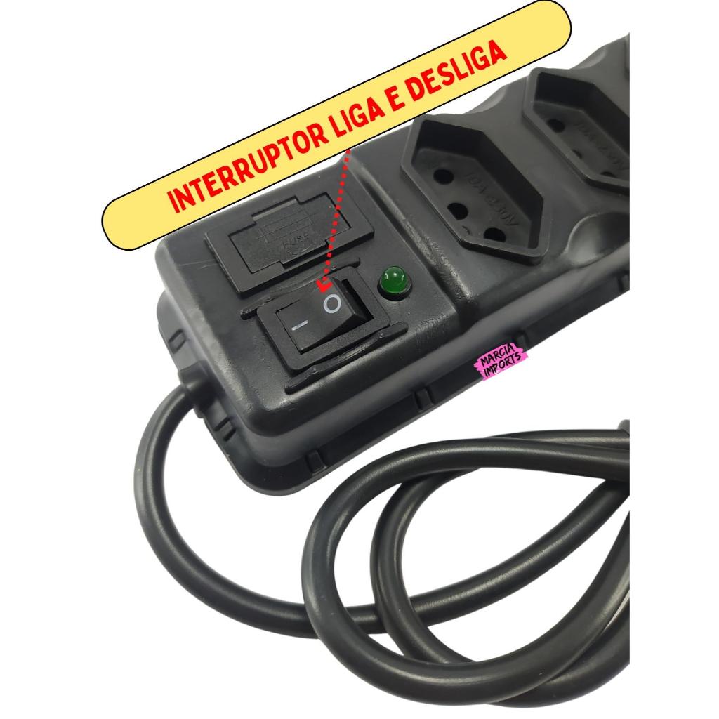 Regua Eletrica 5M Bivolt de 6,5,4 e 3 tomadas Filtro de Linha com Fusivel 110v 220v