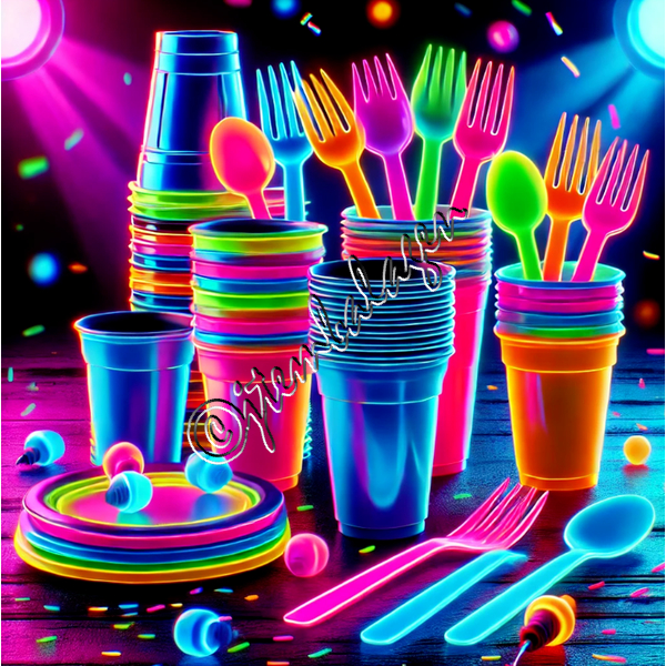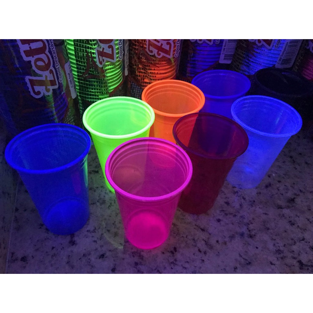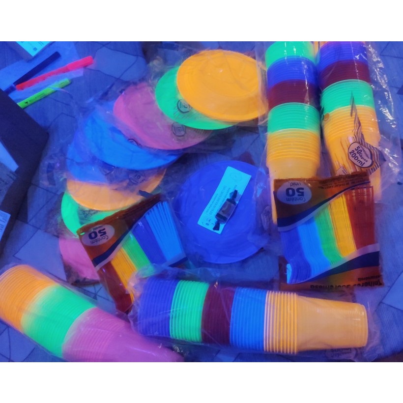 Kit Neon Coloridos Descartaveis 100 Copos 50 Pratinhos 50 Garfinhos. Brilha Na Luz Negra