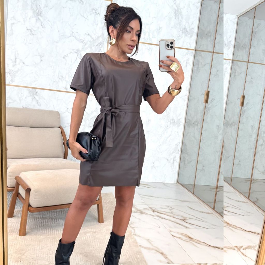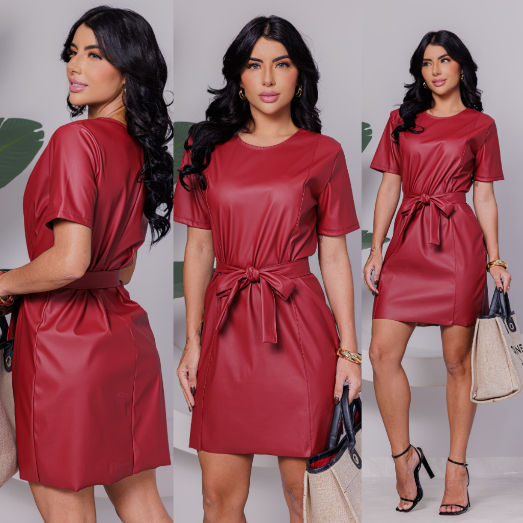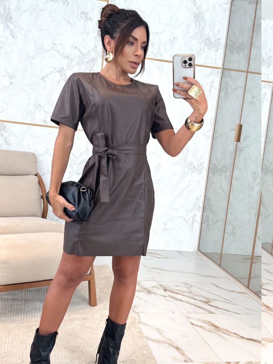 Vestido Curto De Couro Com Cinto no meio Modas Magaly Vestido para Festa