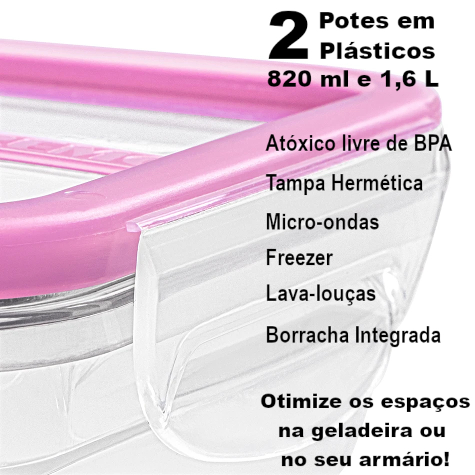 Jogo de POTES HERMÉTICOS - 2 UND. 820ml e 1,6L com Borracha Integrada, vedação total - Atóxico livre de BPA