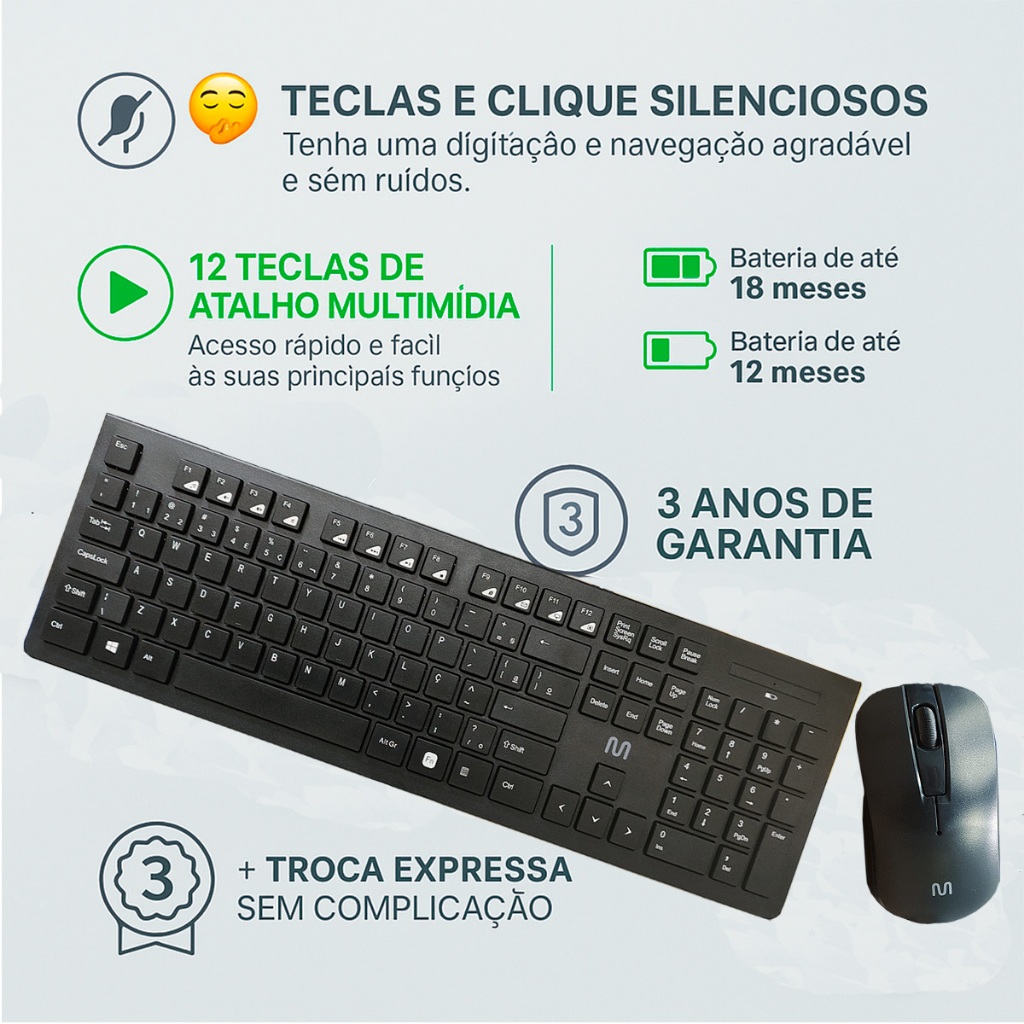 Kit Teclado e Mouse Multilaser TC212 Sem Fio 2.4GHz Wireless USB ABNT2 Pc Teclas Silenciosas