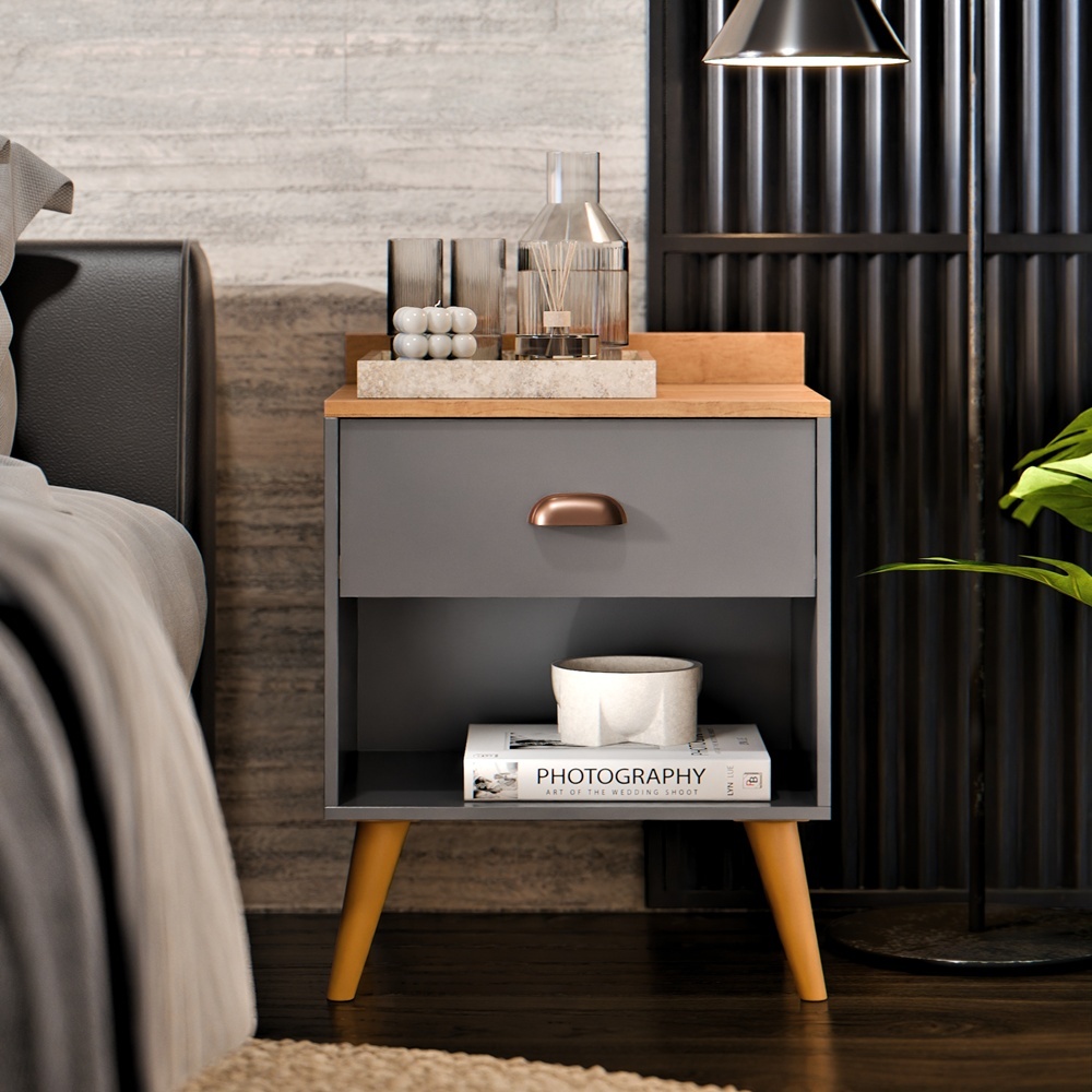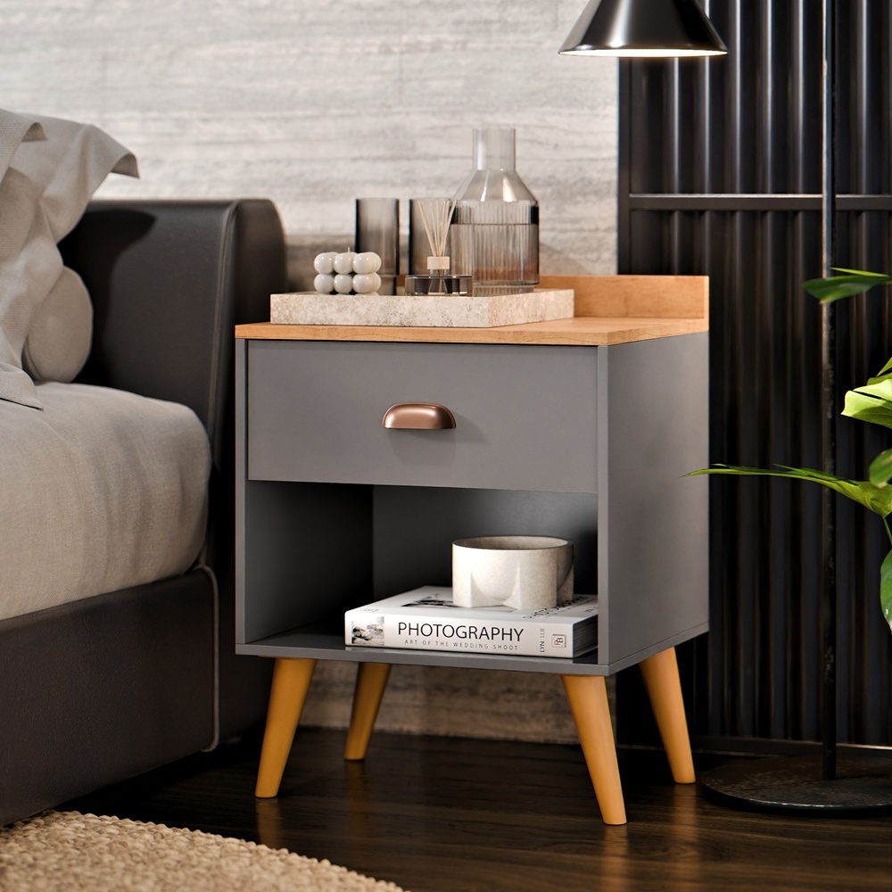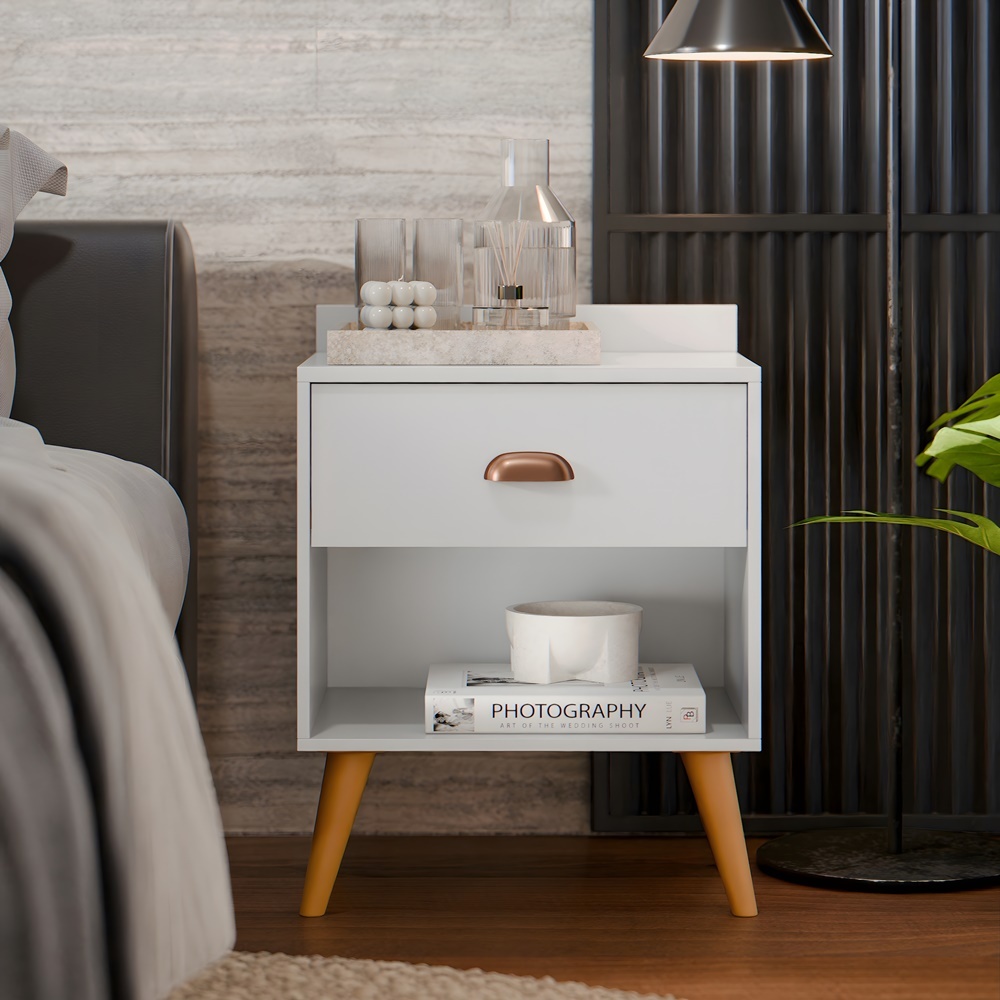 mesa de cabceira / Mesa de cabeceira retrô wood com pés retrô 1 gaveta e puxador