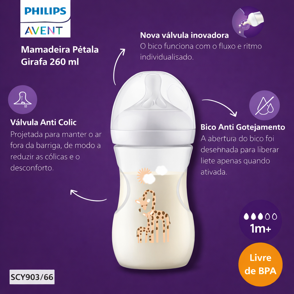 Mamadeira Pétala Avent 3.0 Decorada 260ml 3-6 meses Girafa Philips Avent