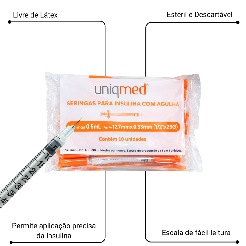 Seringa de Insulina 0,5ml com Agulha 12,7mm x 0,33mm Uniqmed - 10 Unidades de Seringa