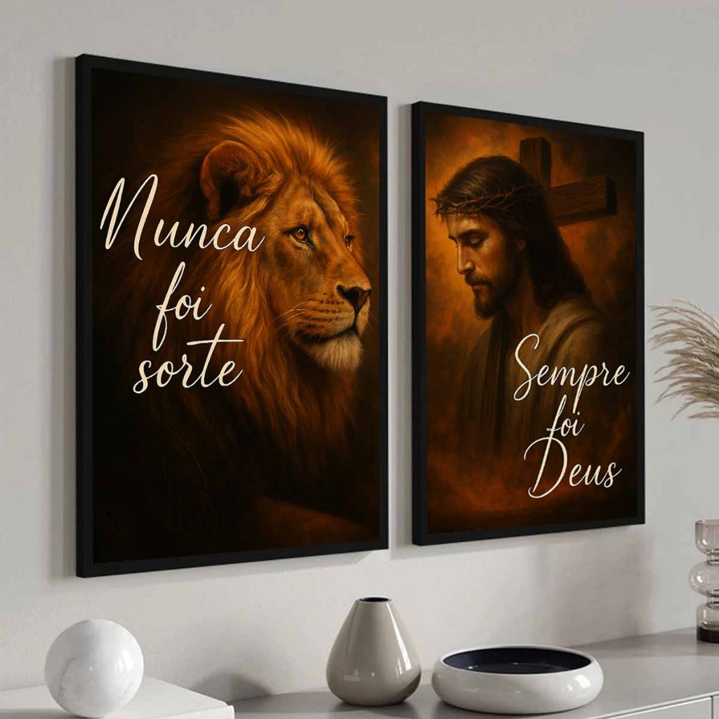 Kit Quadro Decorativo Leão Judá Jesus Cristo Religioso Frase Salmo Nunca foi Sorte Sempre foi Deus