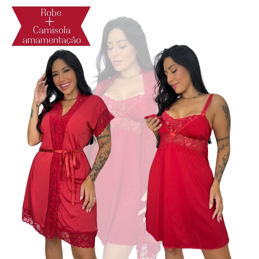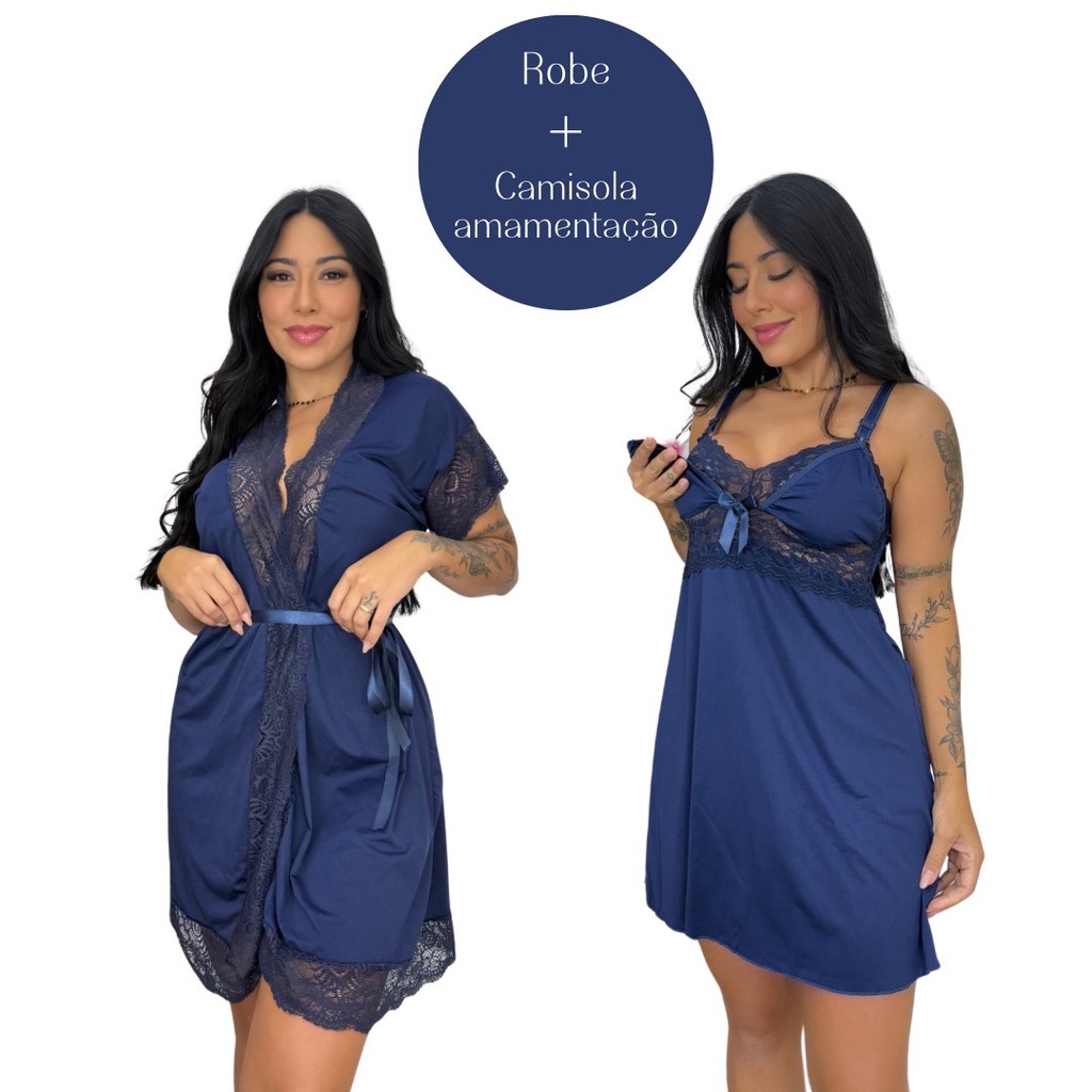 Kit Robe Roupão e Camisola Amamentação Pós Parto Liso Renda Maternidade Gestante