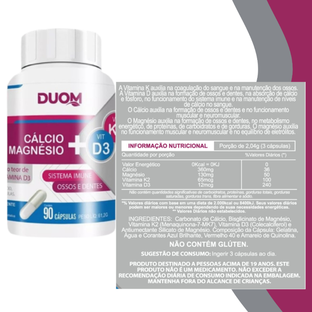 Kit com 2 Cálcio magnésio + Vitamina D3 Vit K2 Duom 90 Cápsulas Duom