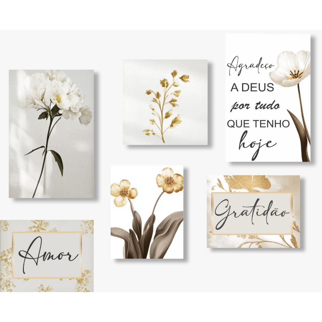 Kit 6 Quadros Decorativo Mdf Sala Grande Folhas Flores claras abstrato frases amor gratidão
