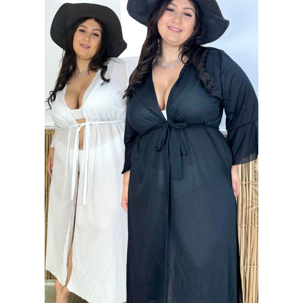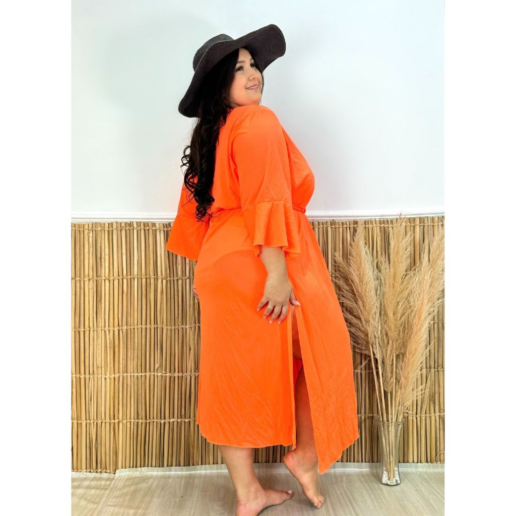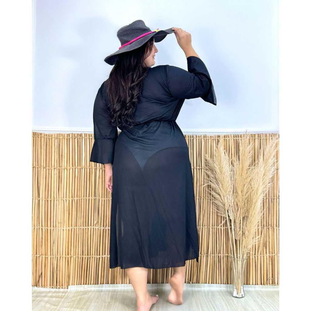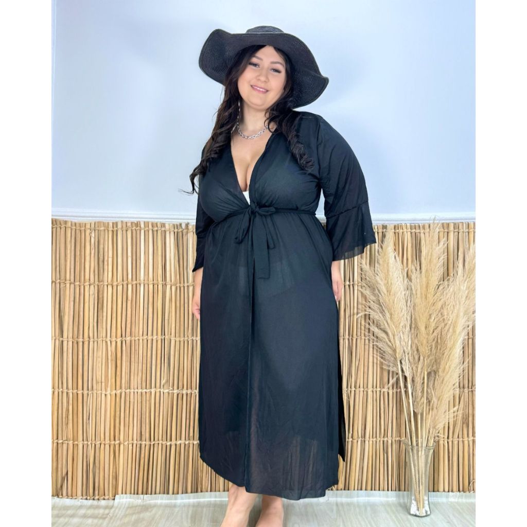 Saída de Praia Manga 3/4 Kimono PLUS SIZE Longa de Amarrar com Fenda
