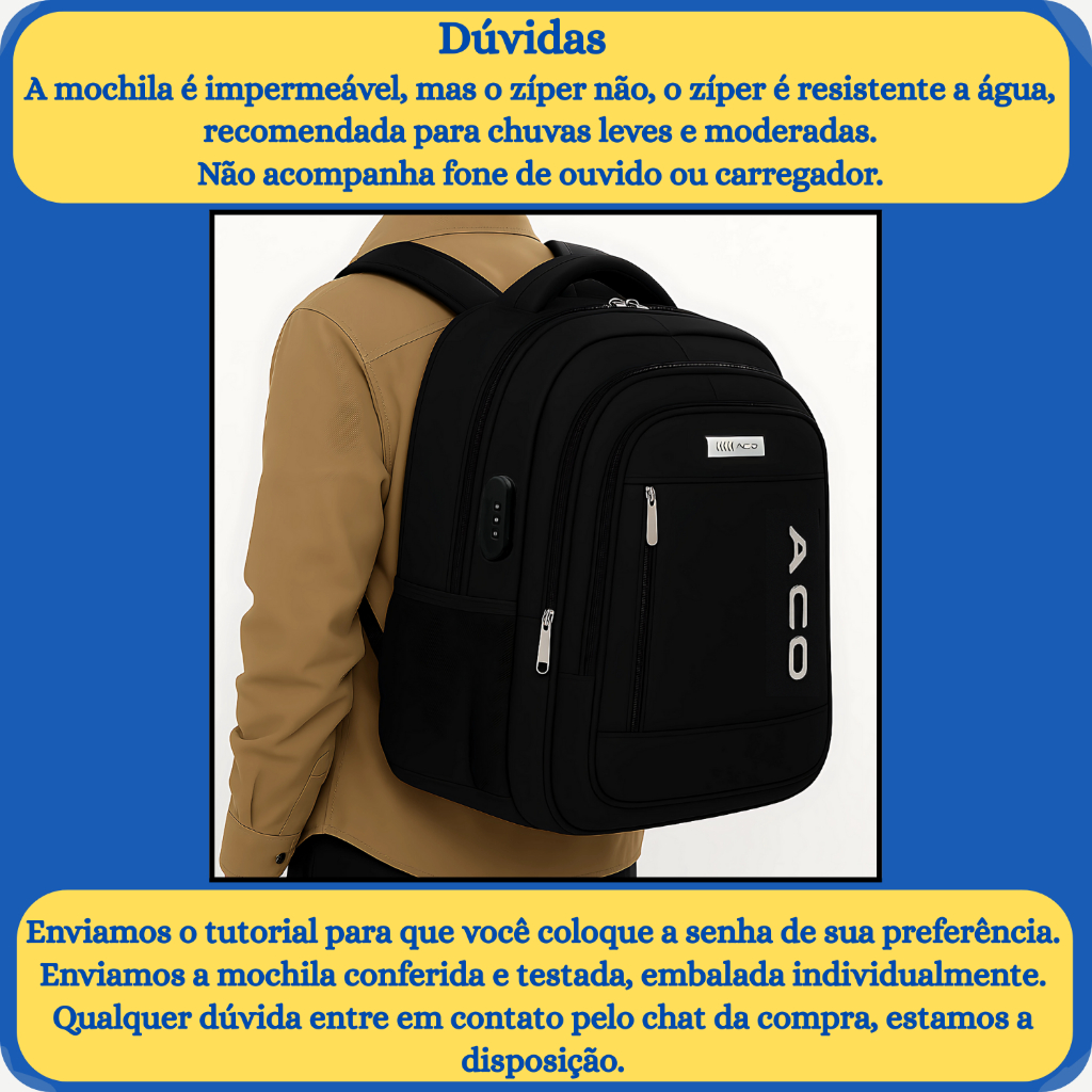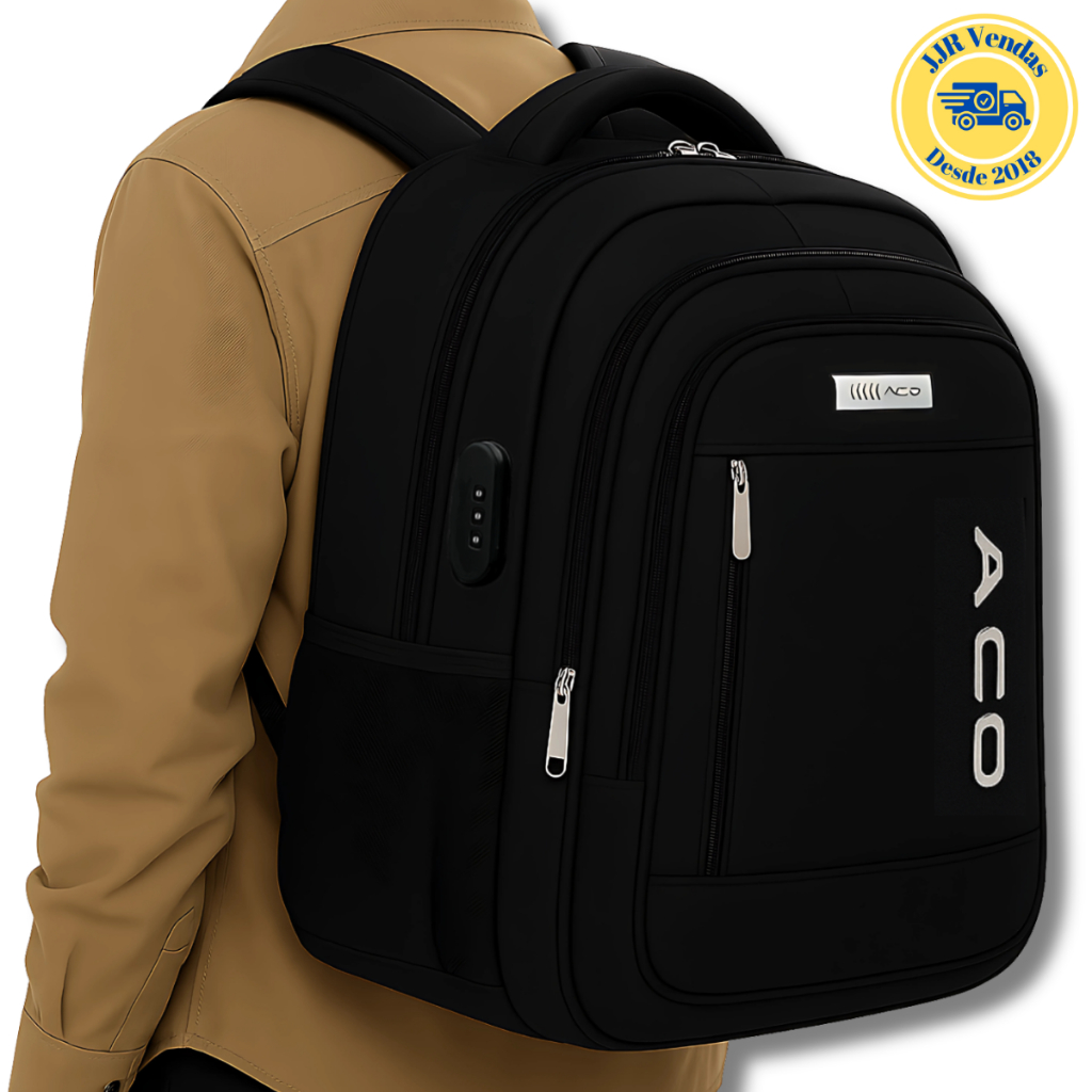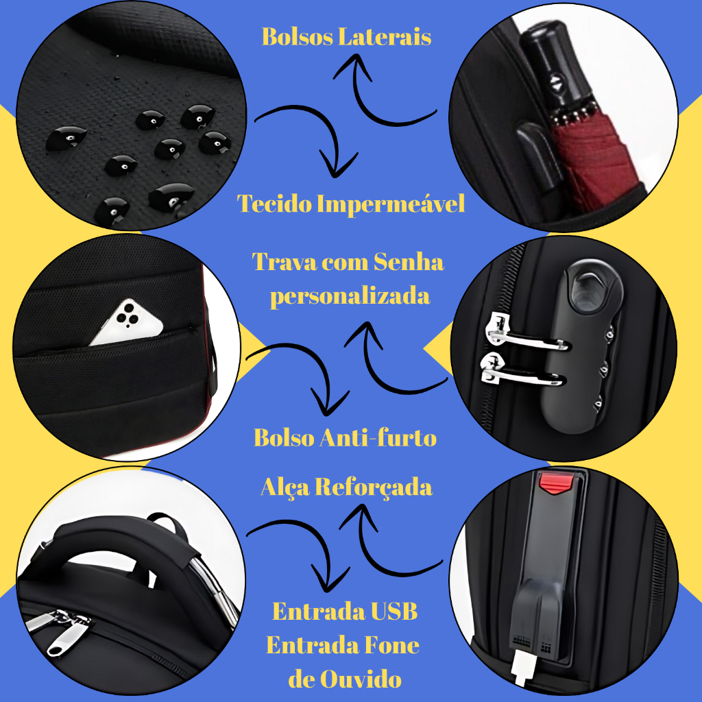 Mochila Notebook Antifurto c/ Senha e Entradas p/ Fone de Ouvido Impermeável Acolchoada Unissex