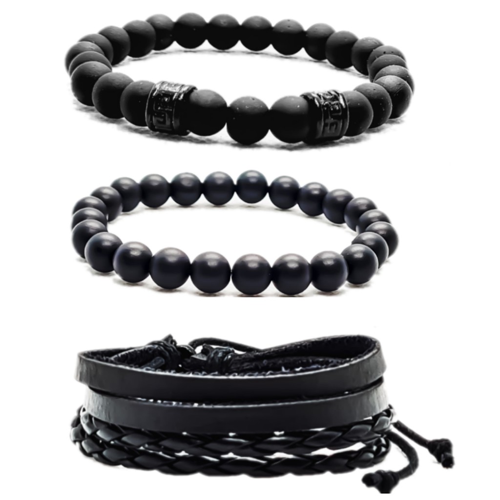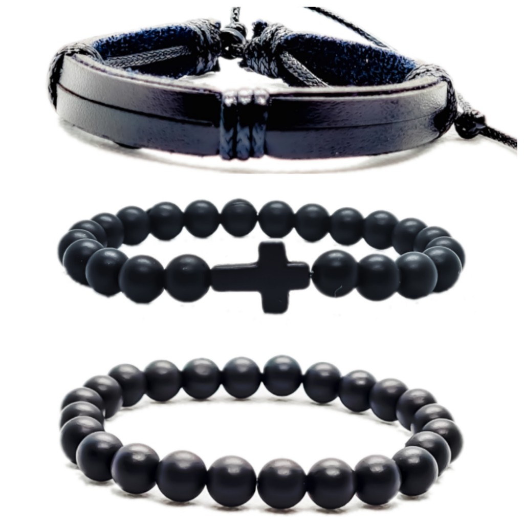 Kit 3 Pulseiras Braceletes Couro Moda Acessórios Masculino Feminino Ajustável Sendo Pulseira Trançada, Pulseira Voltas e Pulseira Bolinhas