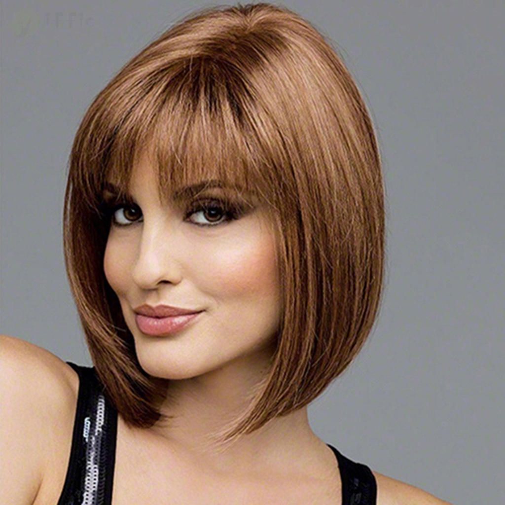 Perucas Curtas Moda Fashion Bob Seda Realistas Peruca Curta Reta Para Senhora,Em Estoque Peruca De Cabelo Curto Castanho Com Franja Natural Look Muito Resistente