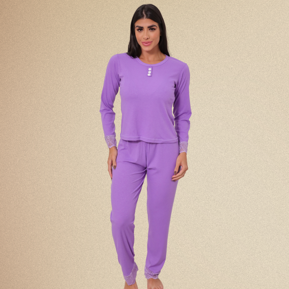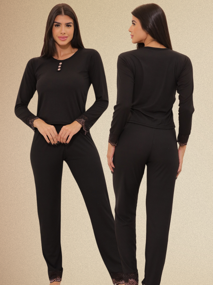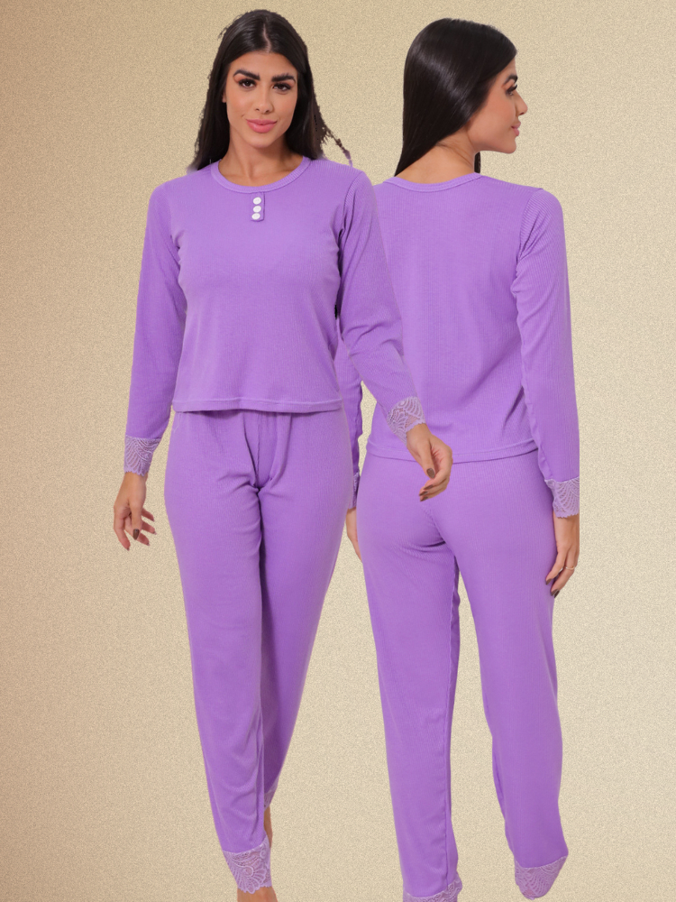 Pijama Canelado Longo Calça Feminino Blogueirinha