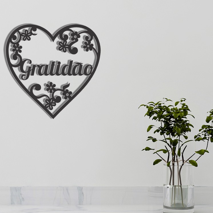 Quadro Decorativo MDF Coração com palavra Gratidão Preto Vazado