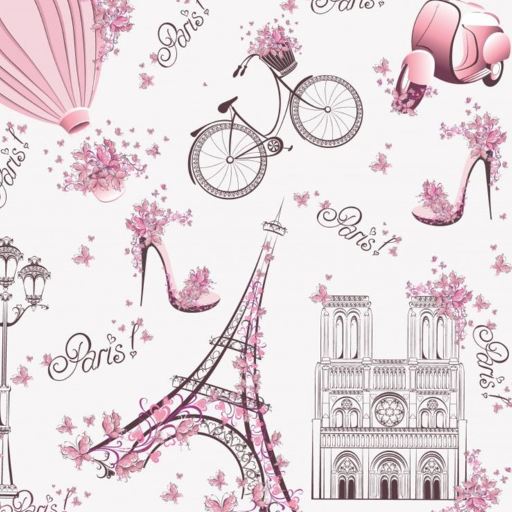 Papel de Parede Infantil Paris fundo rosa claro Lambretas e Flores Para Sala e Quarto 2,50 Mts
