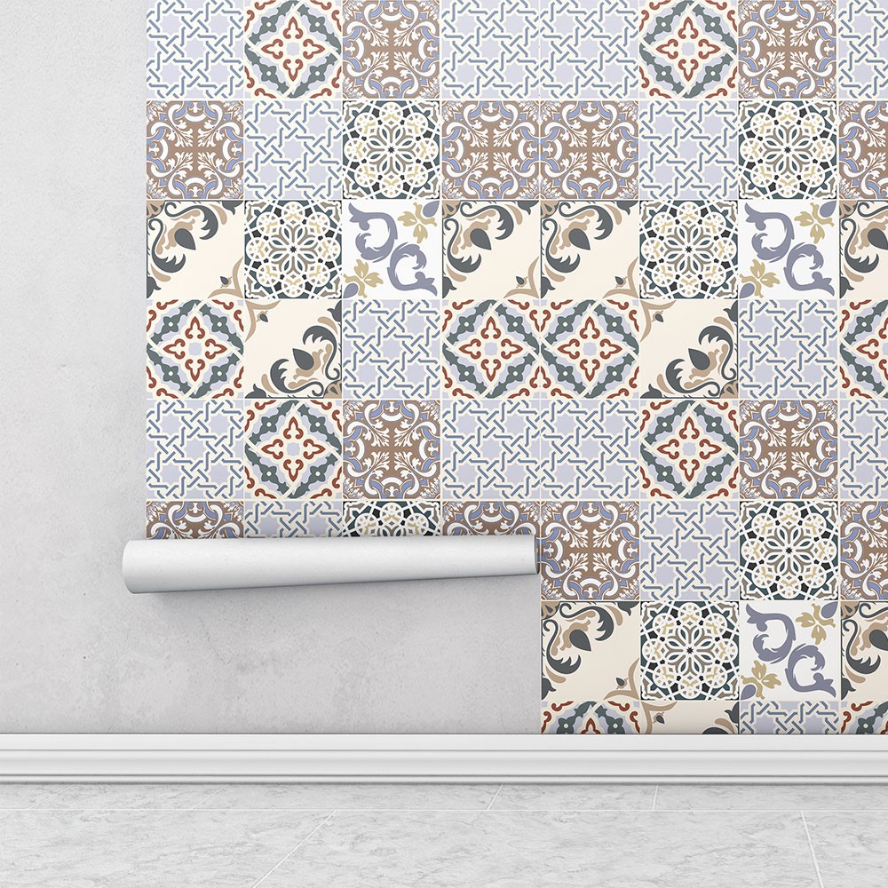 Adesivo Azulejo em tons azul, bege, marrom, cinza, e preto