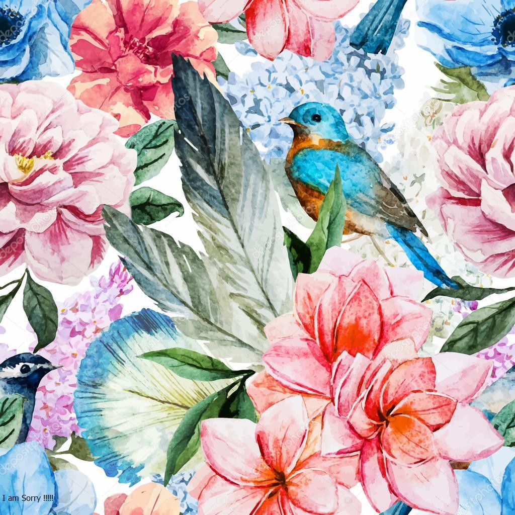 Papel De Parede Aquarela Floral Flores Pássaro Pintura