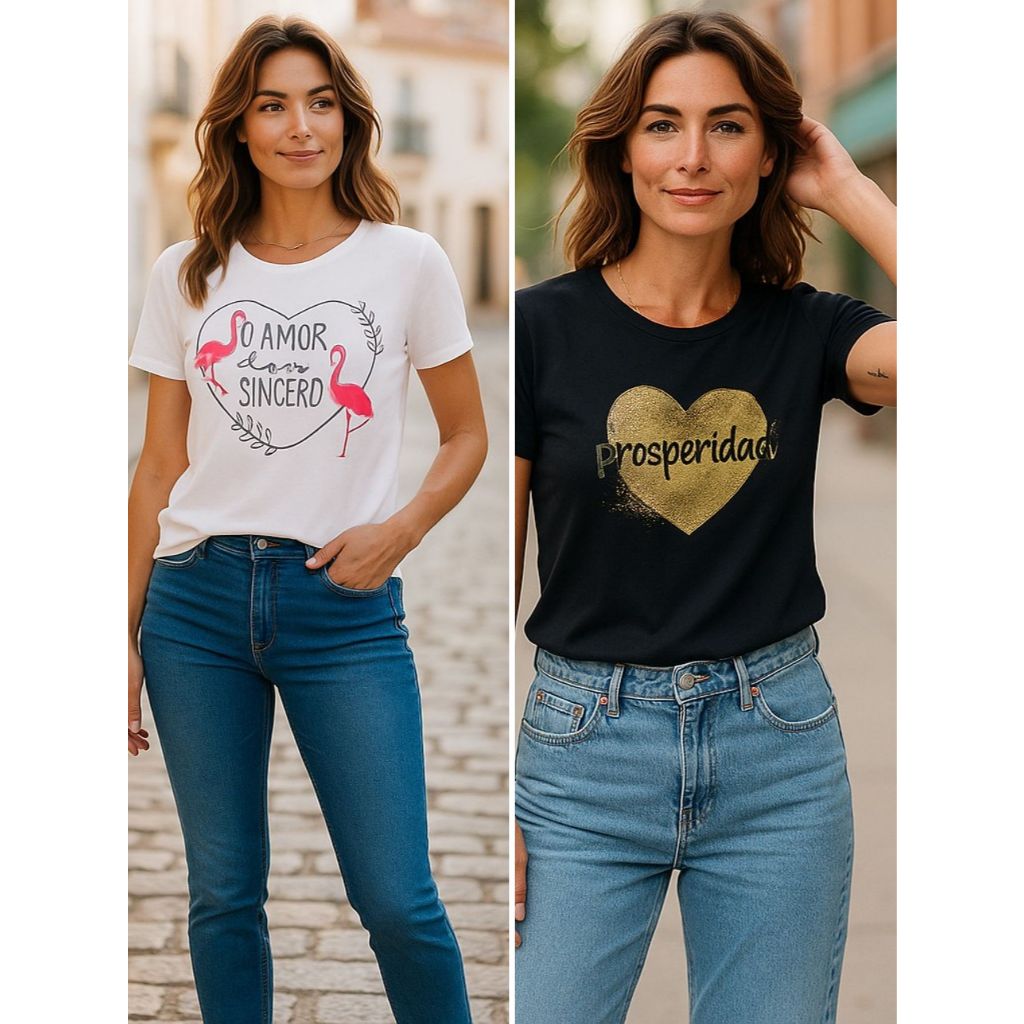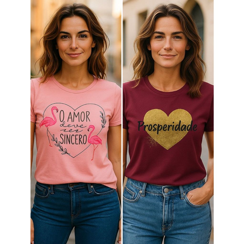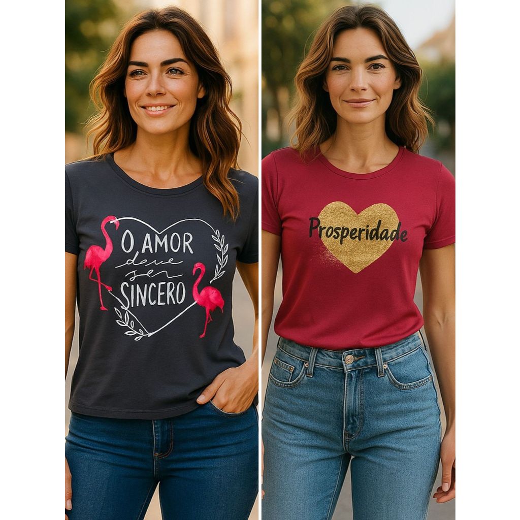 Kit 2 blusas femininas estampa amor sincero e prosperidade