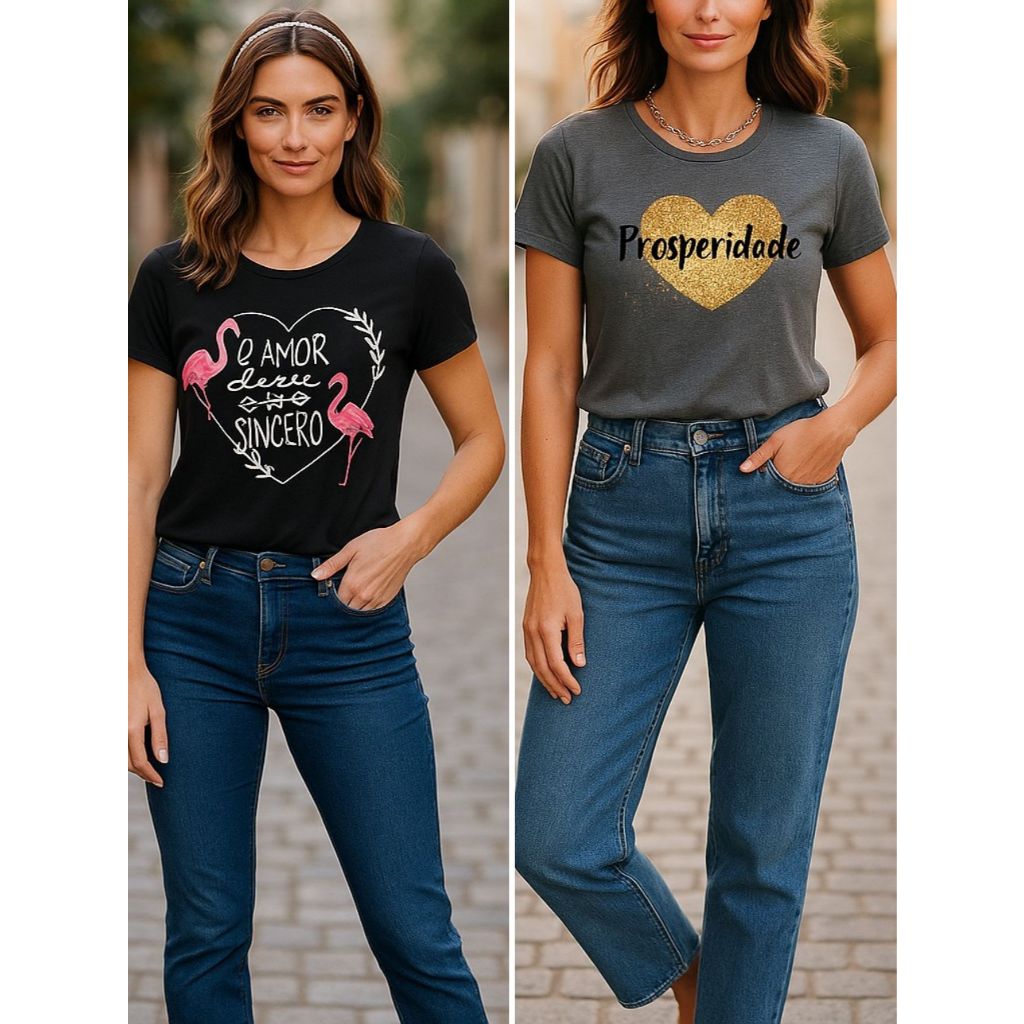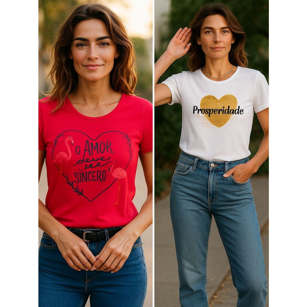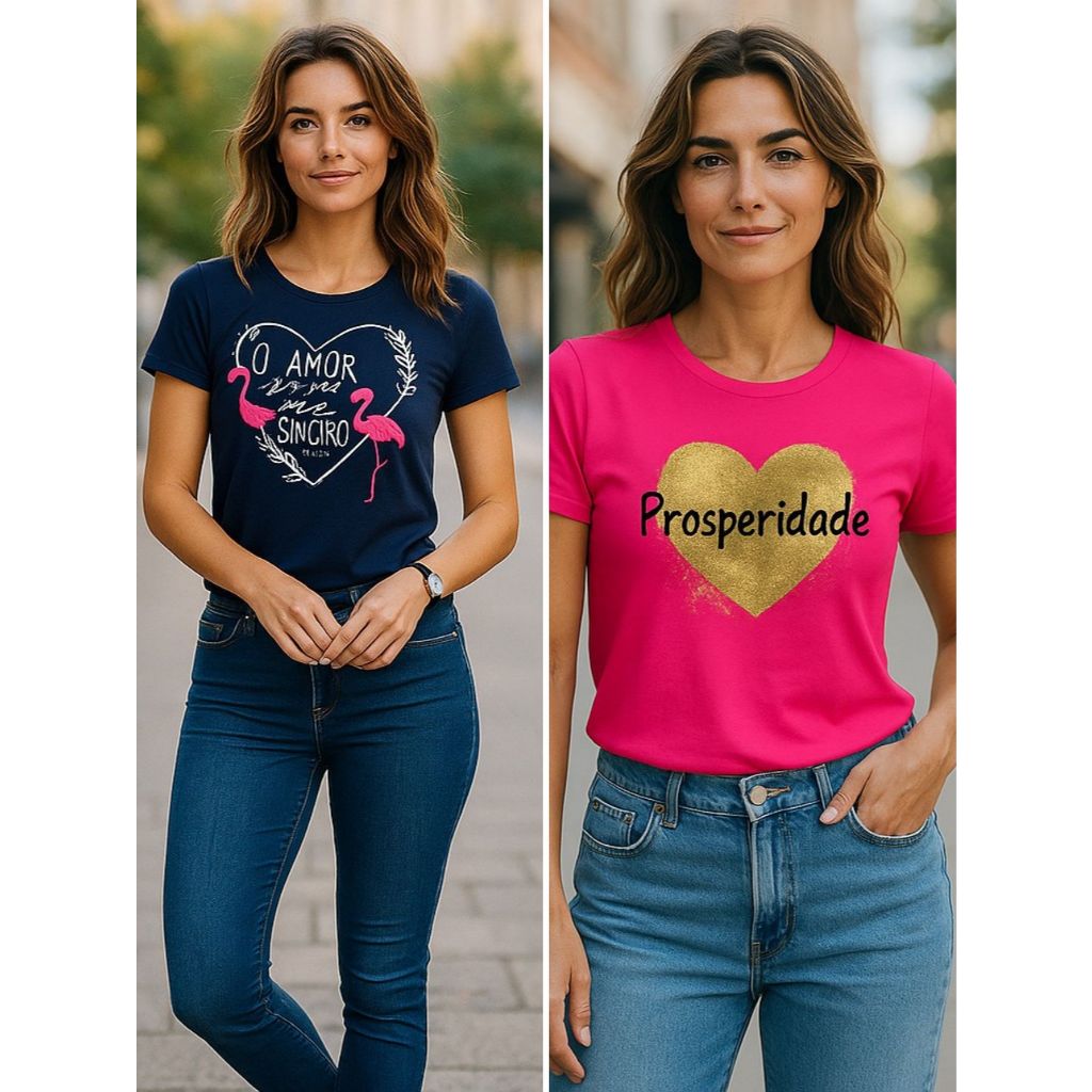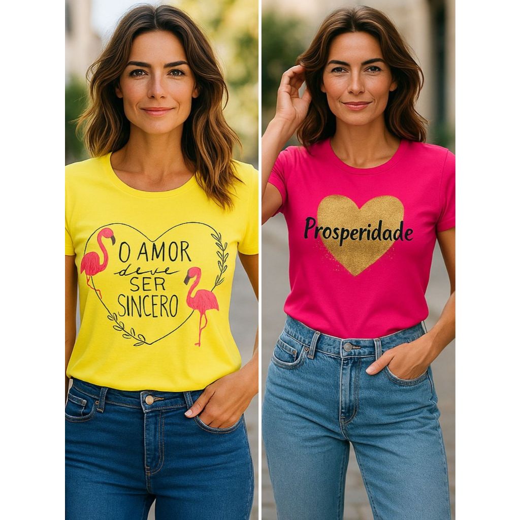 Kit 2 blusas femininas estampa amor sincero e prosperidade