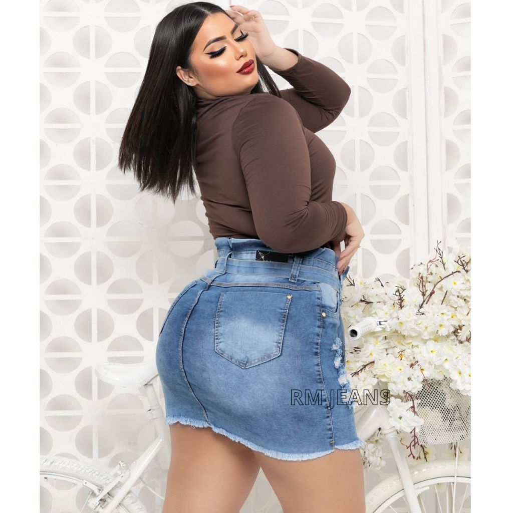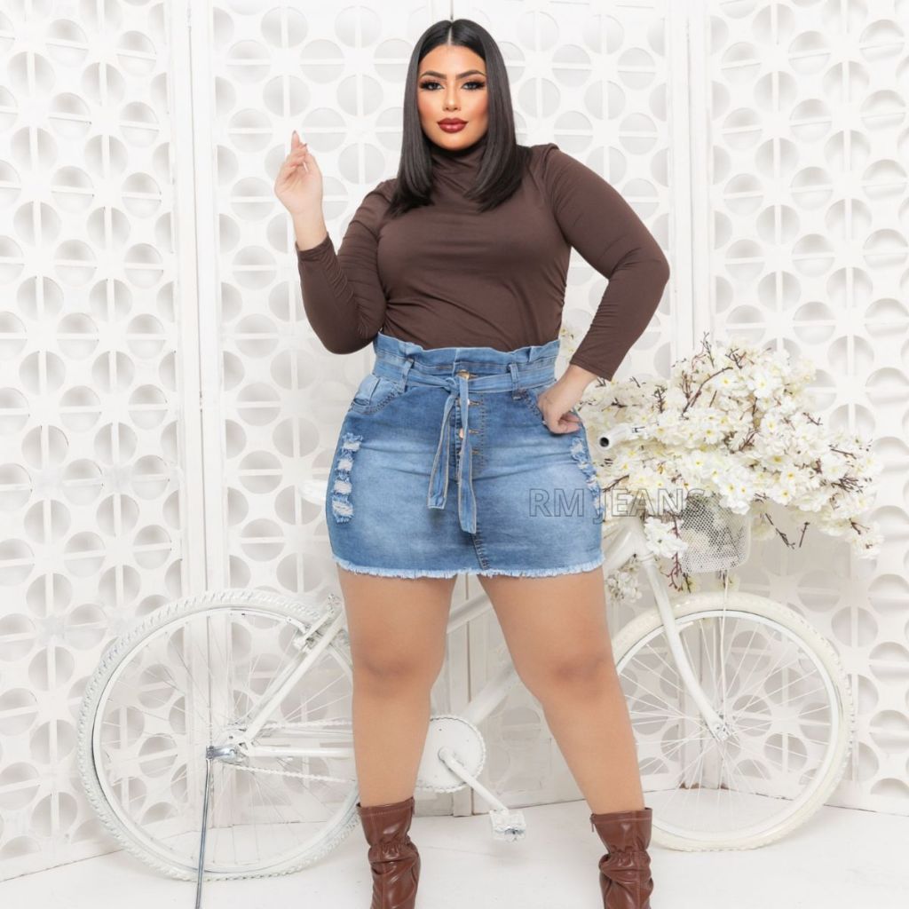 saia jeans feminina plus size com Lycra azul claro cos de babadinho