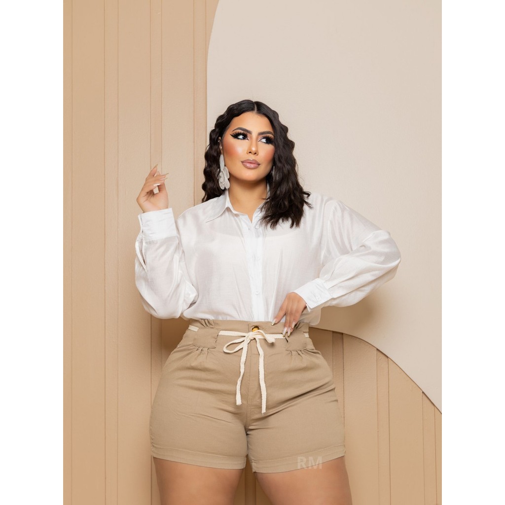 SHORT JEANS FEMININO PLUS SIZE COM LYCRA BEGE COM CORDAO