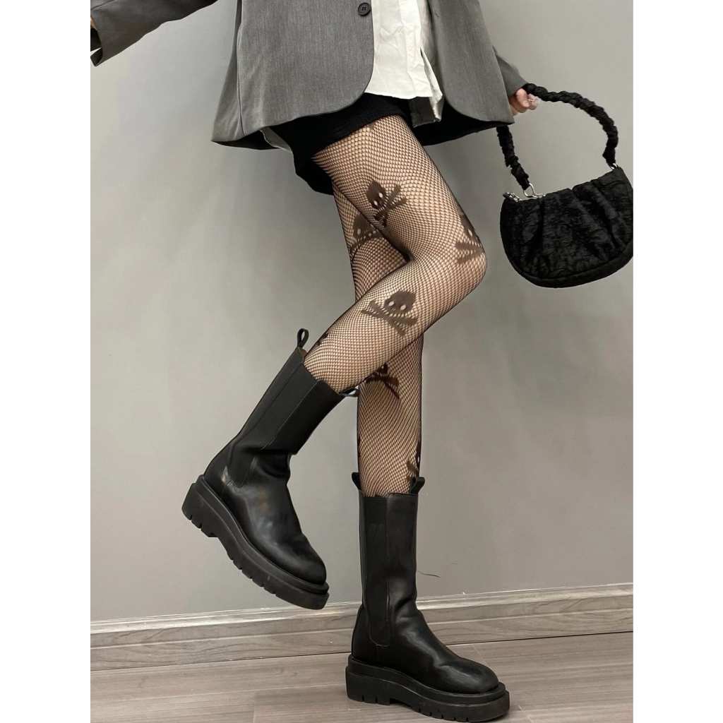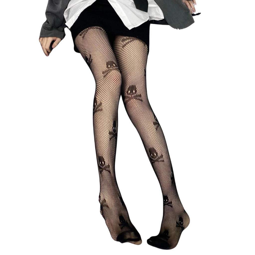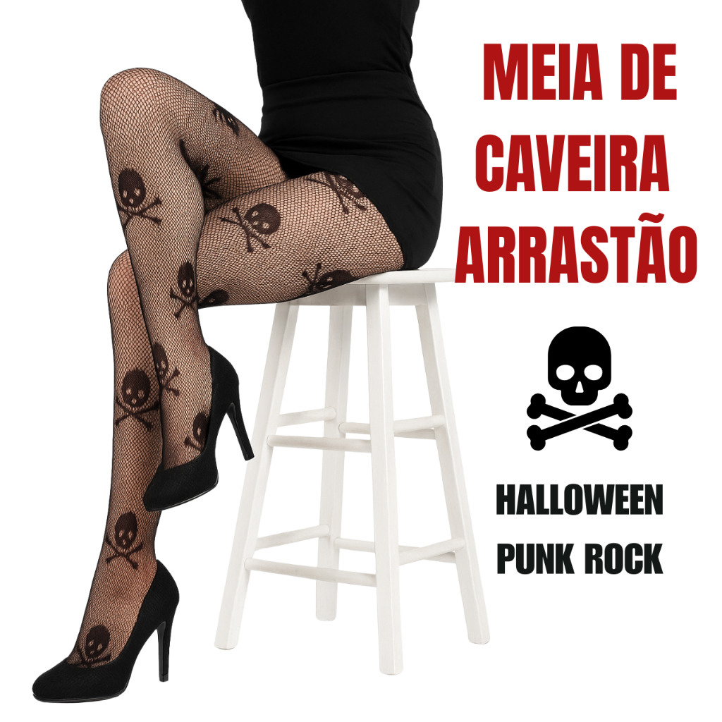 Meia de Caveira Arrastão Preta Feminina Gótica Halloween Punk Rock Egirl Cosplay Festa Fantasia