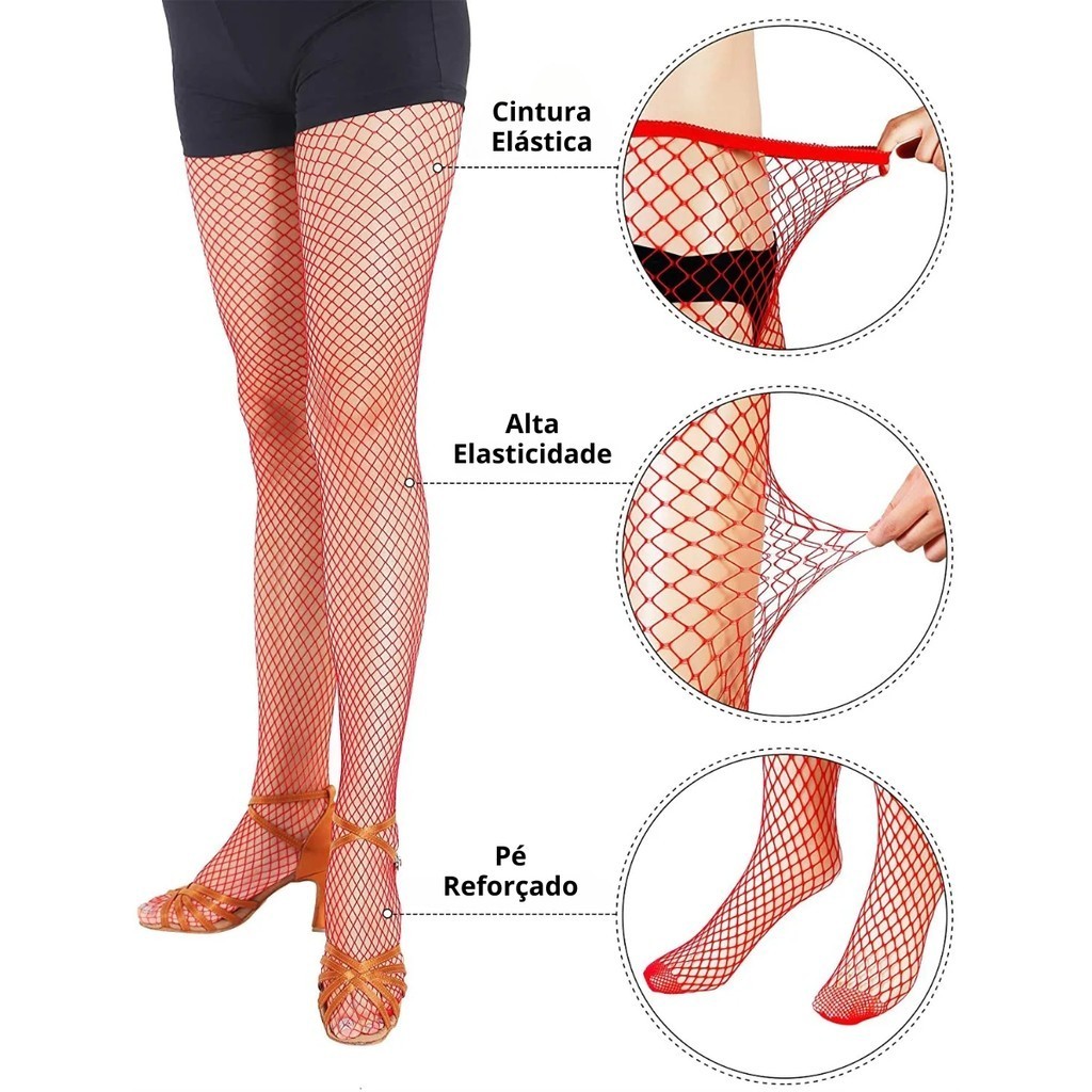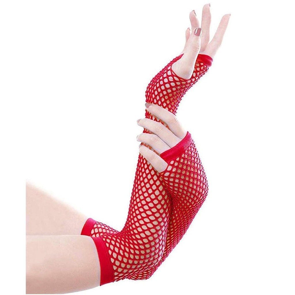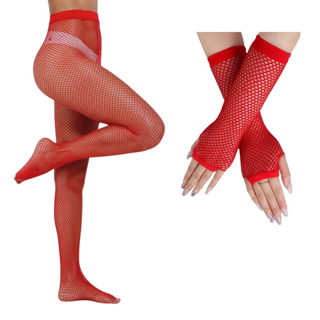 Kit 1 Meia Calça Arrastão Vermelha + 1 Luva Arrastão Festa Egirl Gótica