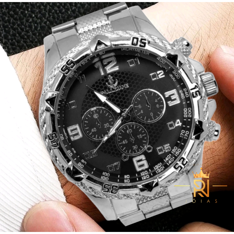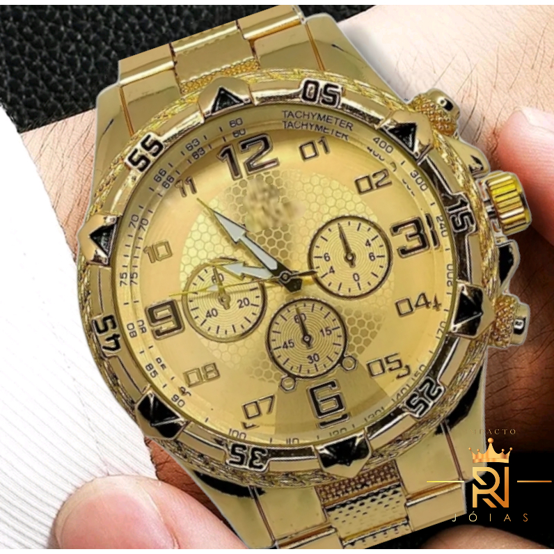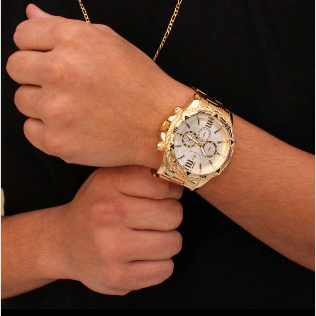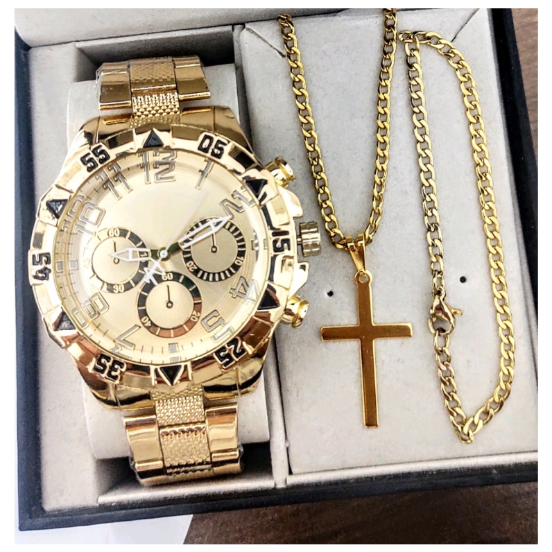 Conjunto relógio masculino + corrente cruz e pulseira dourado