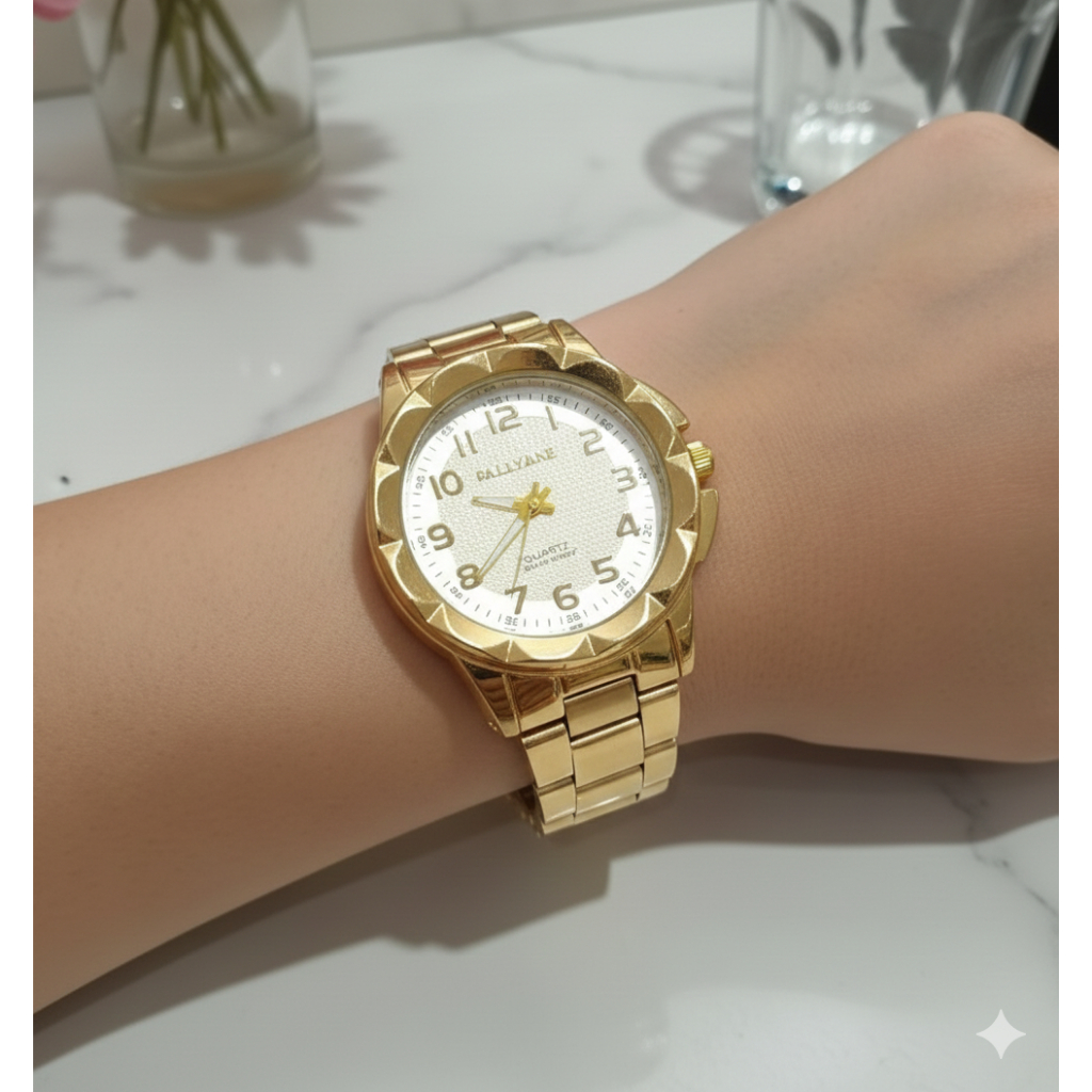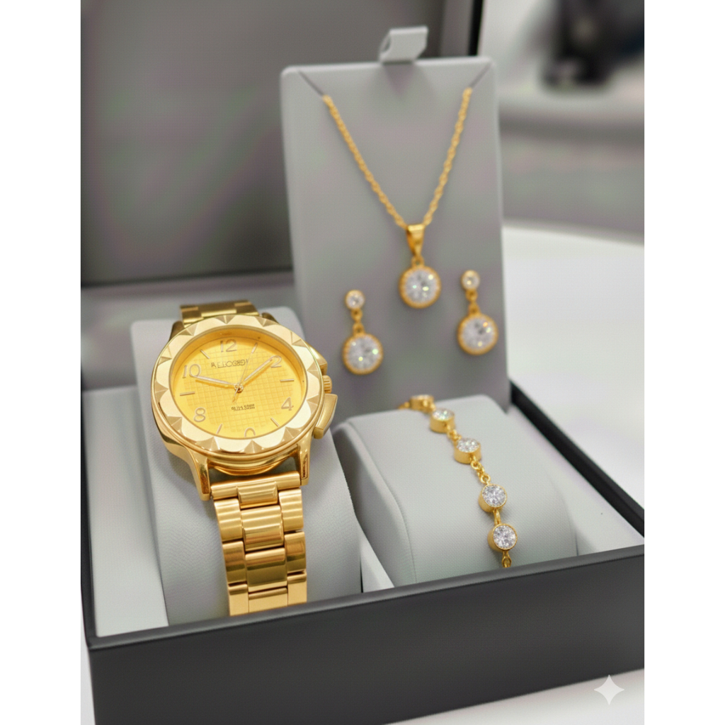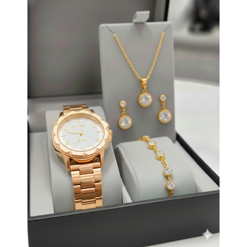 Kit Relógio de Pulso Feminino Quartzo Pulseira aço inox + Conjunto Colar e Par de Brincos Folheado