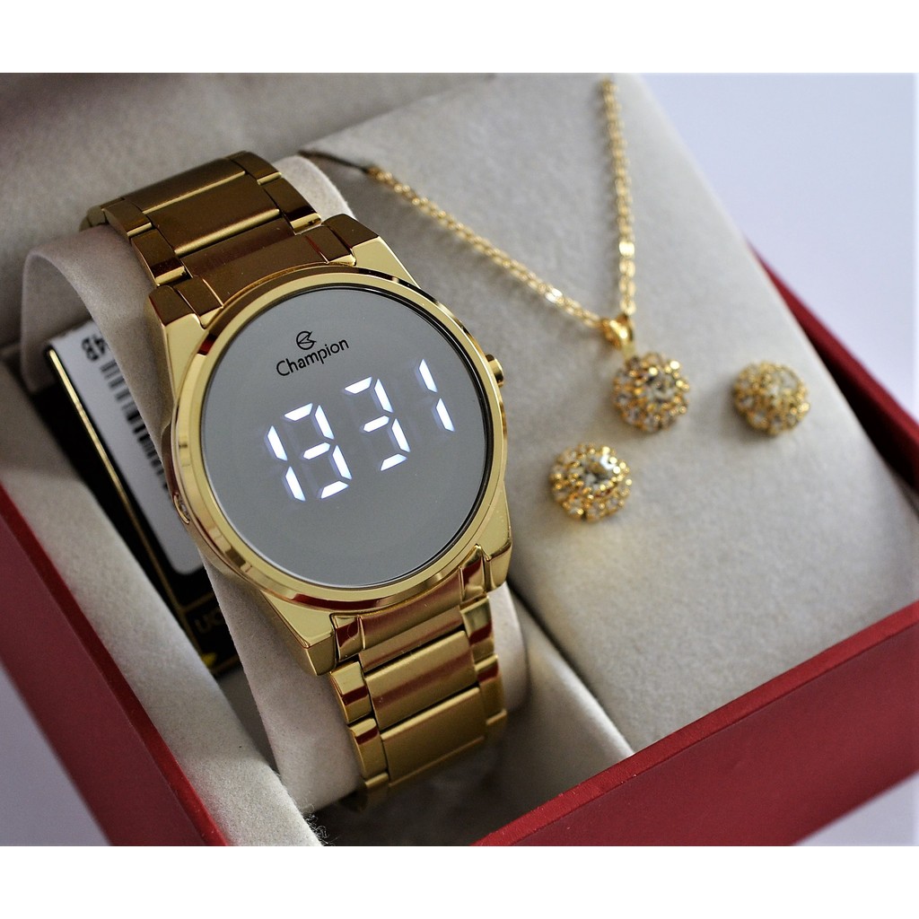 RELOGIO CHAMPION DOURADO REDONDO ESPELHADO LANÇAMENTO CH40124B + KIT SEMI JOIA