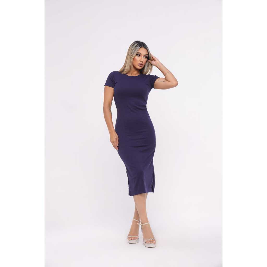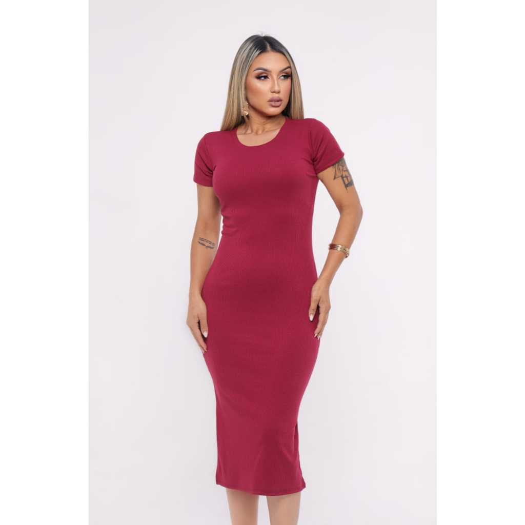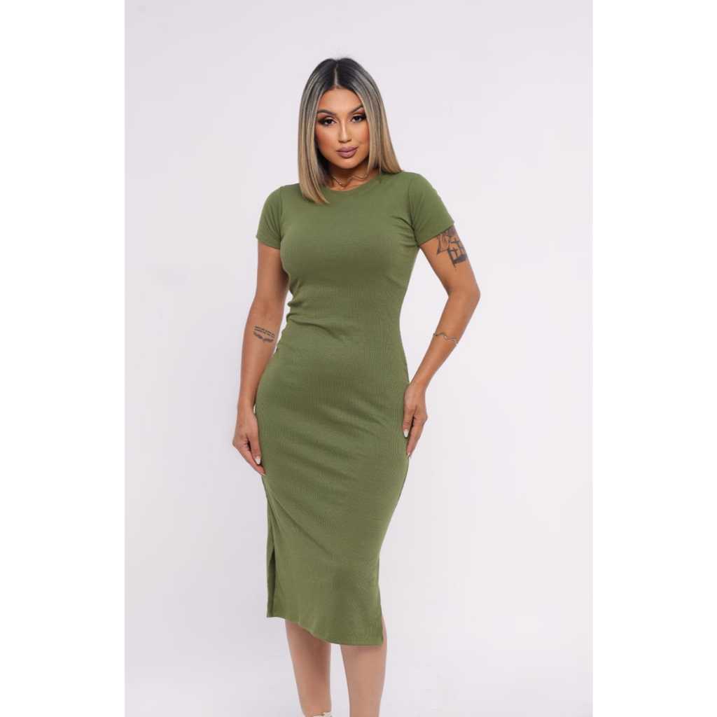 Vestido Feminino Mídi Canelado Manga Curta com Fenda Lateral Básico Casual e Elegante