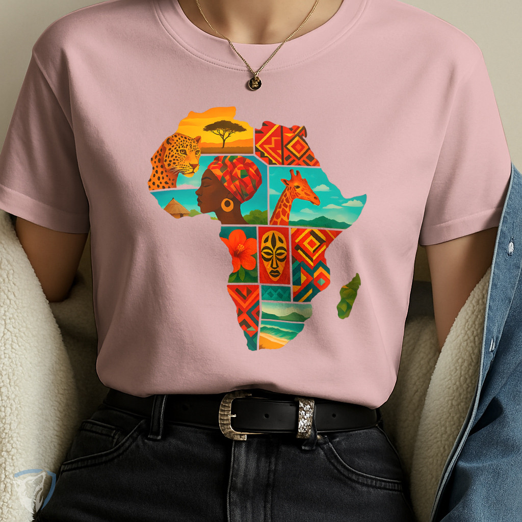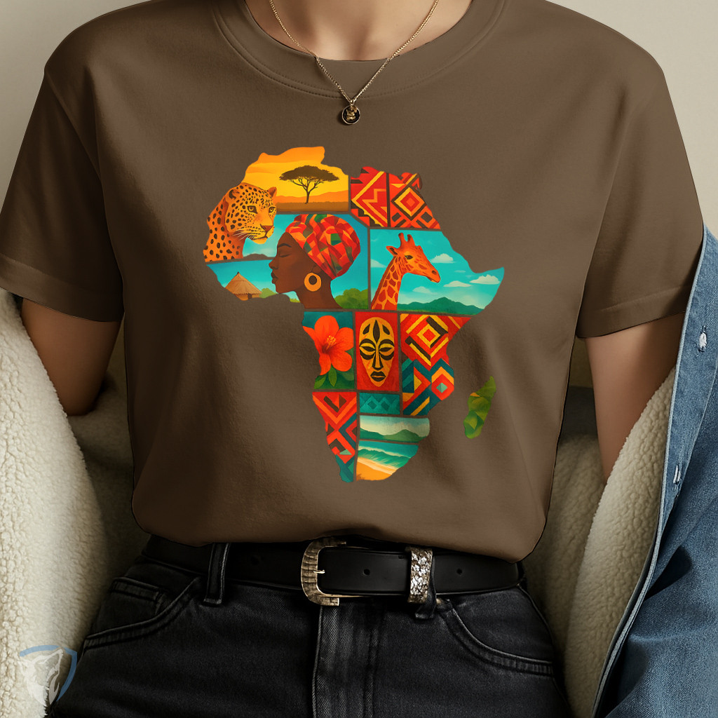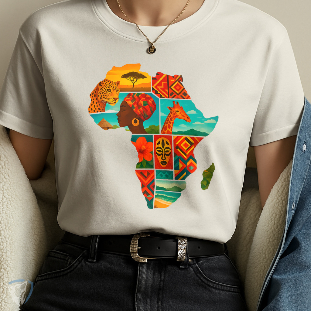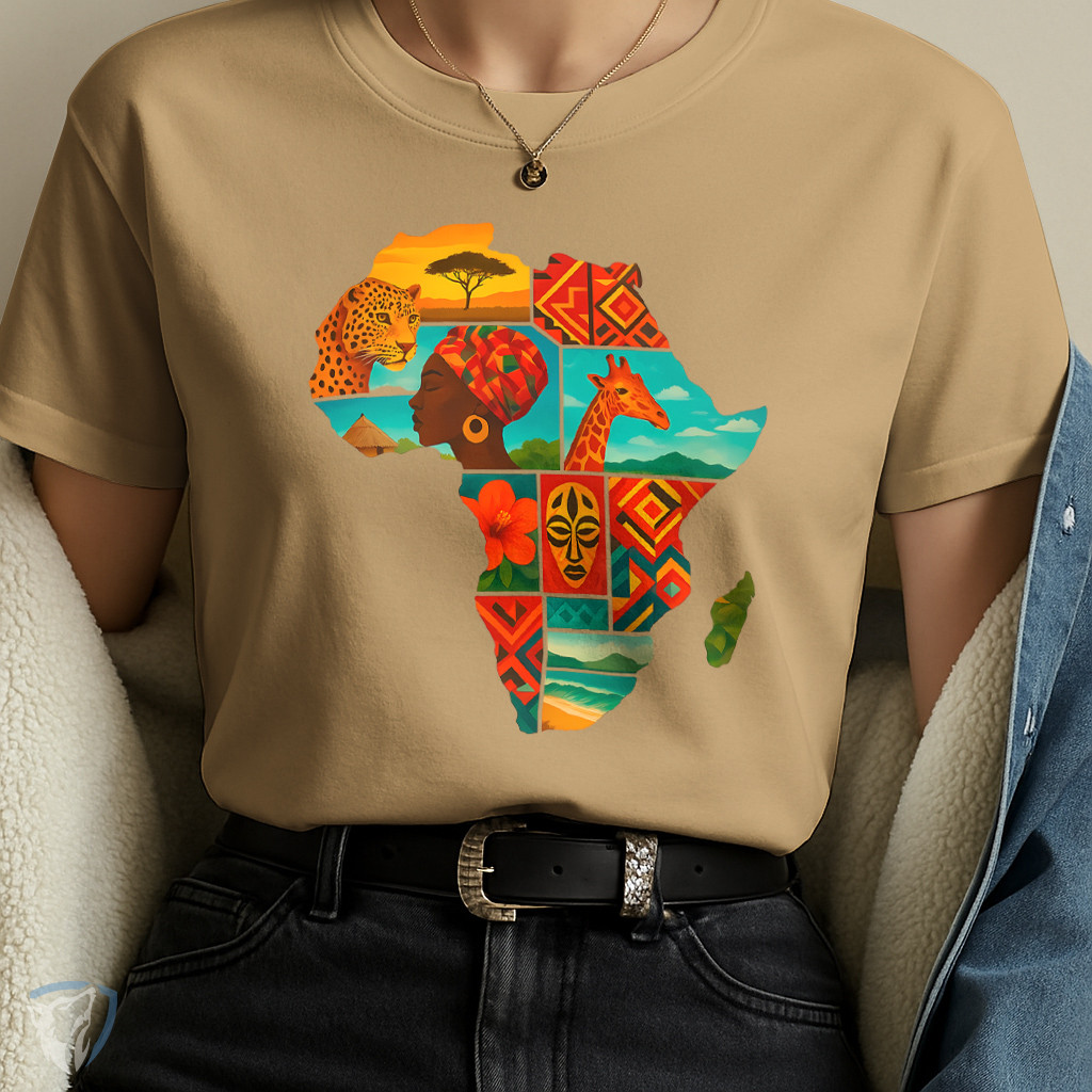 Camiseta Arte Africana Estampada – Mapa da África com Cultura e Natureza