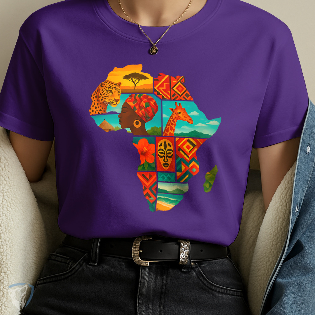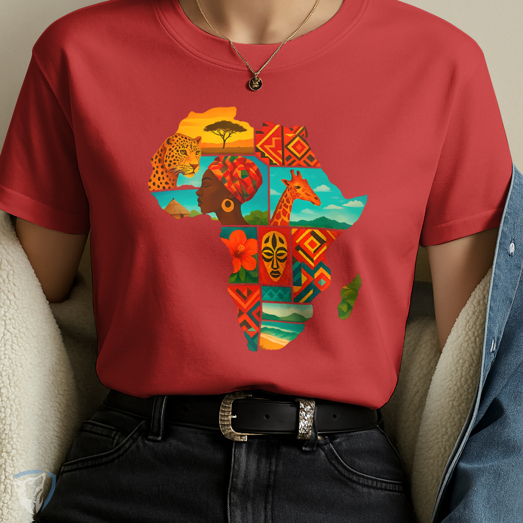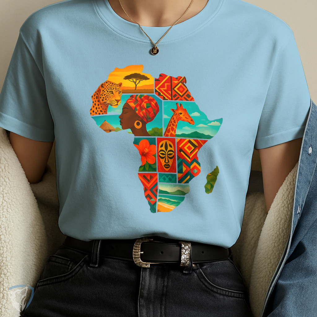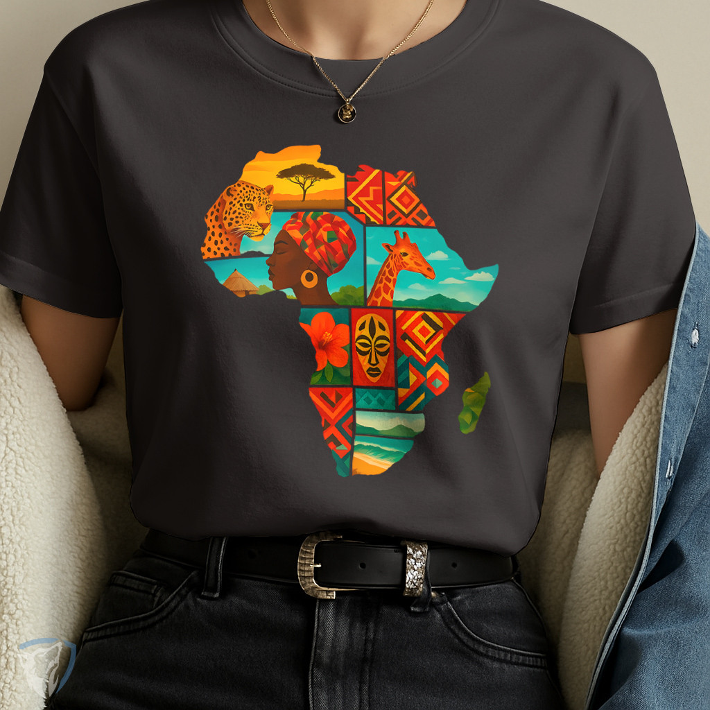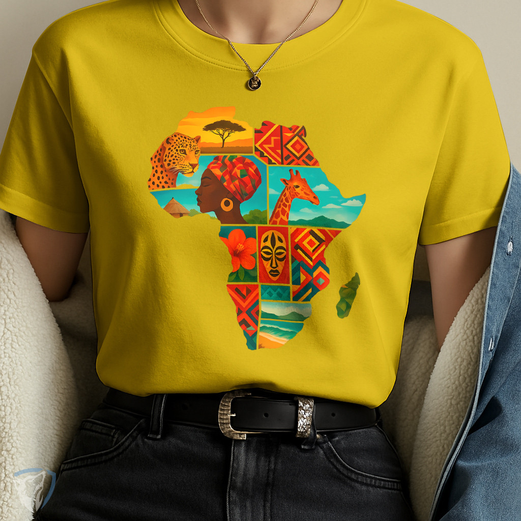 Camiseta Arte Africana Estampada – Mapa da África com Cultura e Natureza