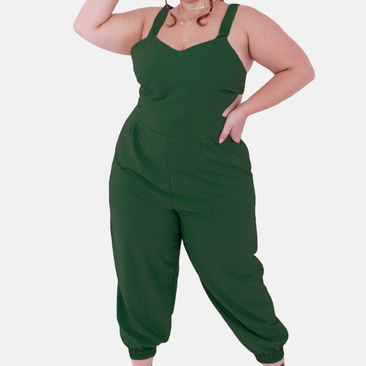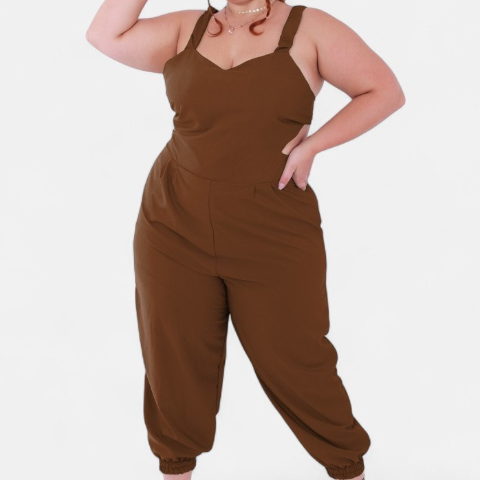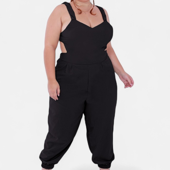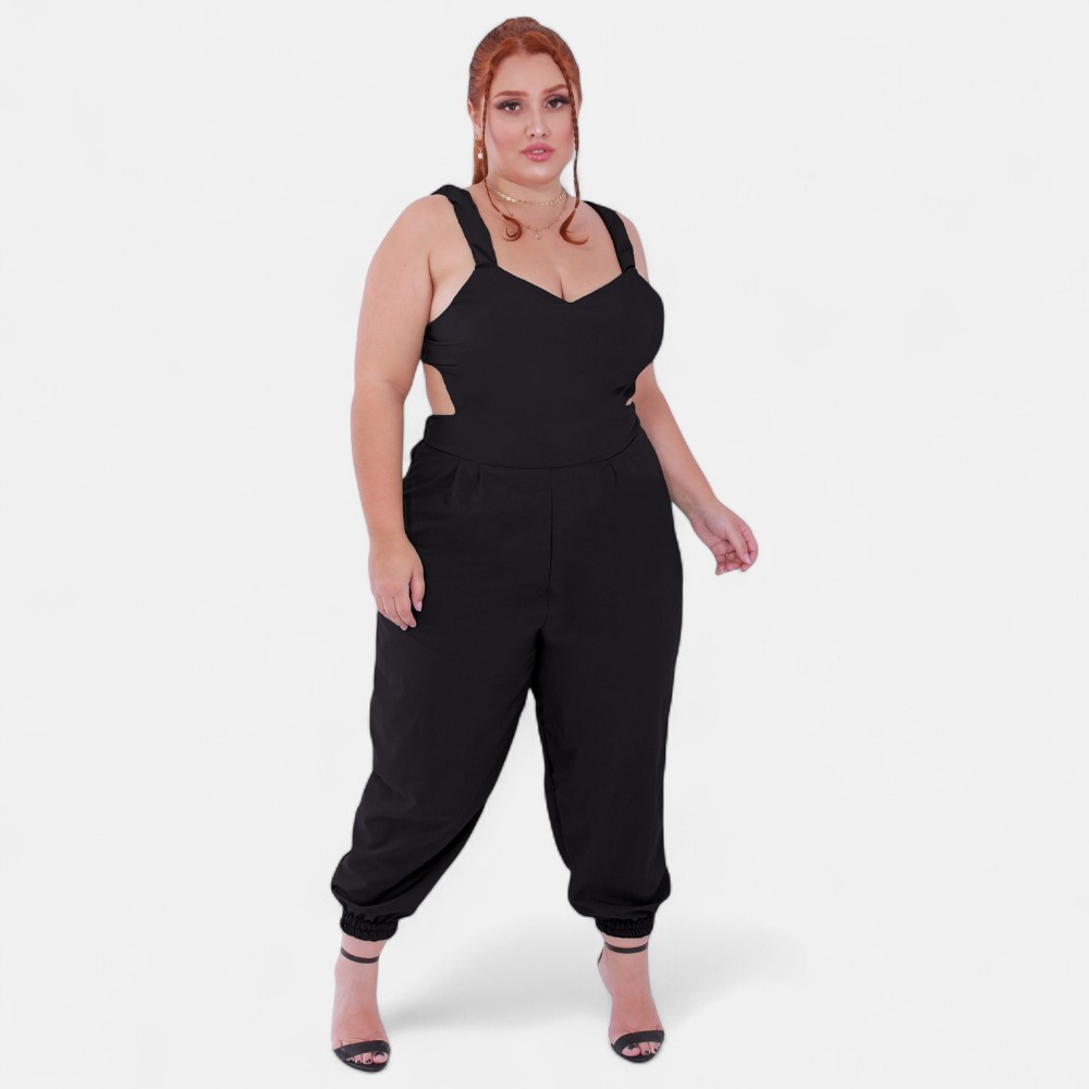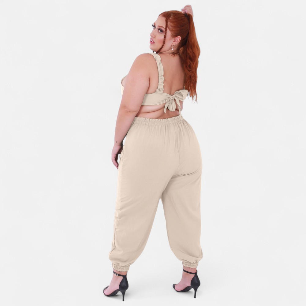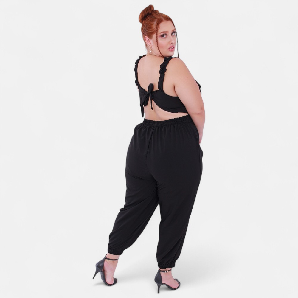 Macacao Plus Size Jogger Skinny Pantacourt Meia Canela Bojo Costa Nua Laço sem Bolsos Outono/Inverno