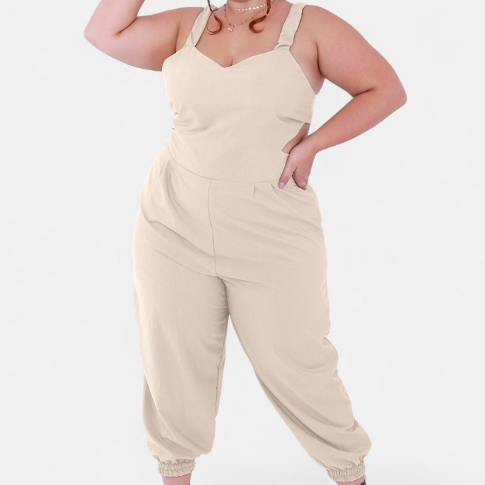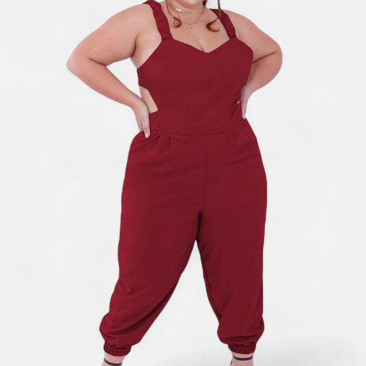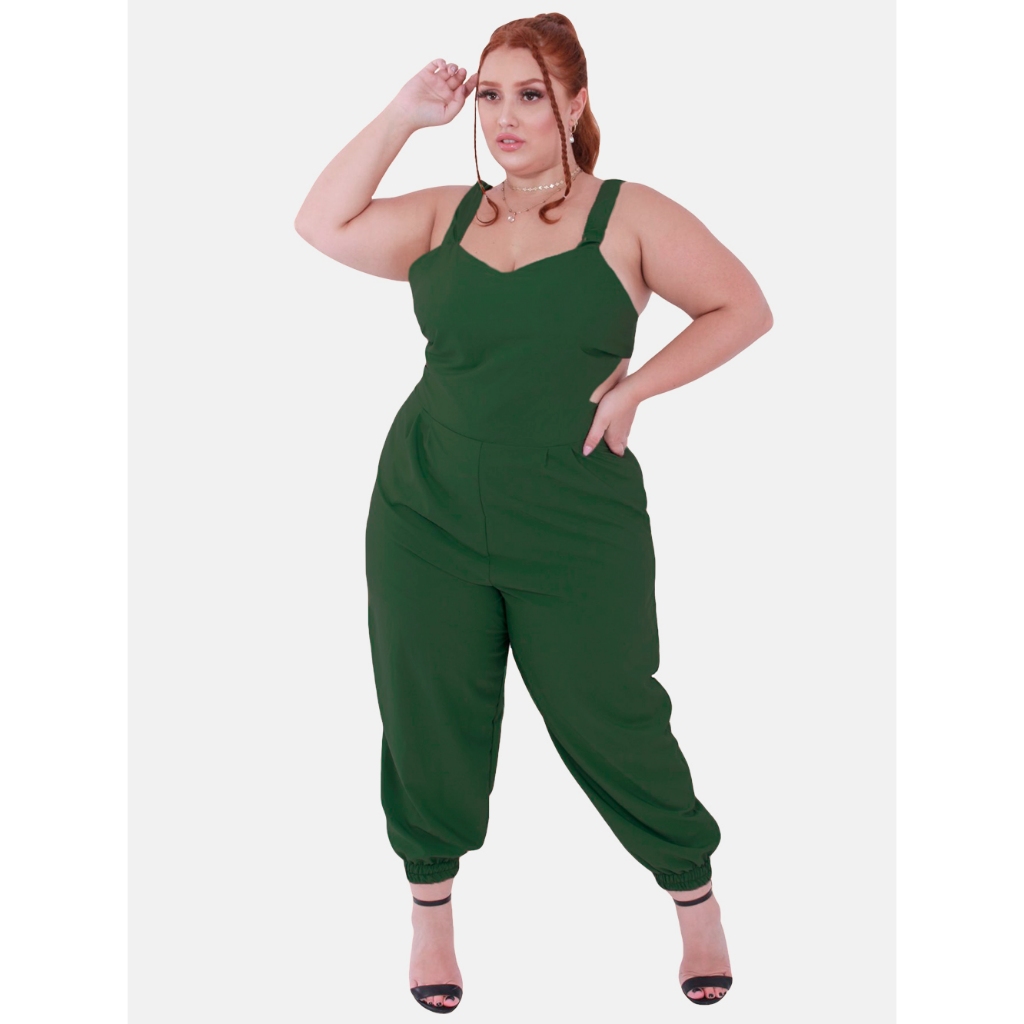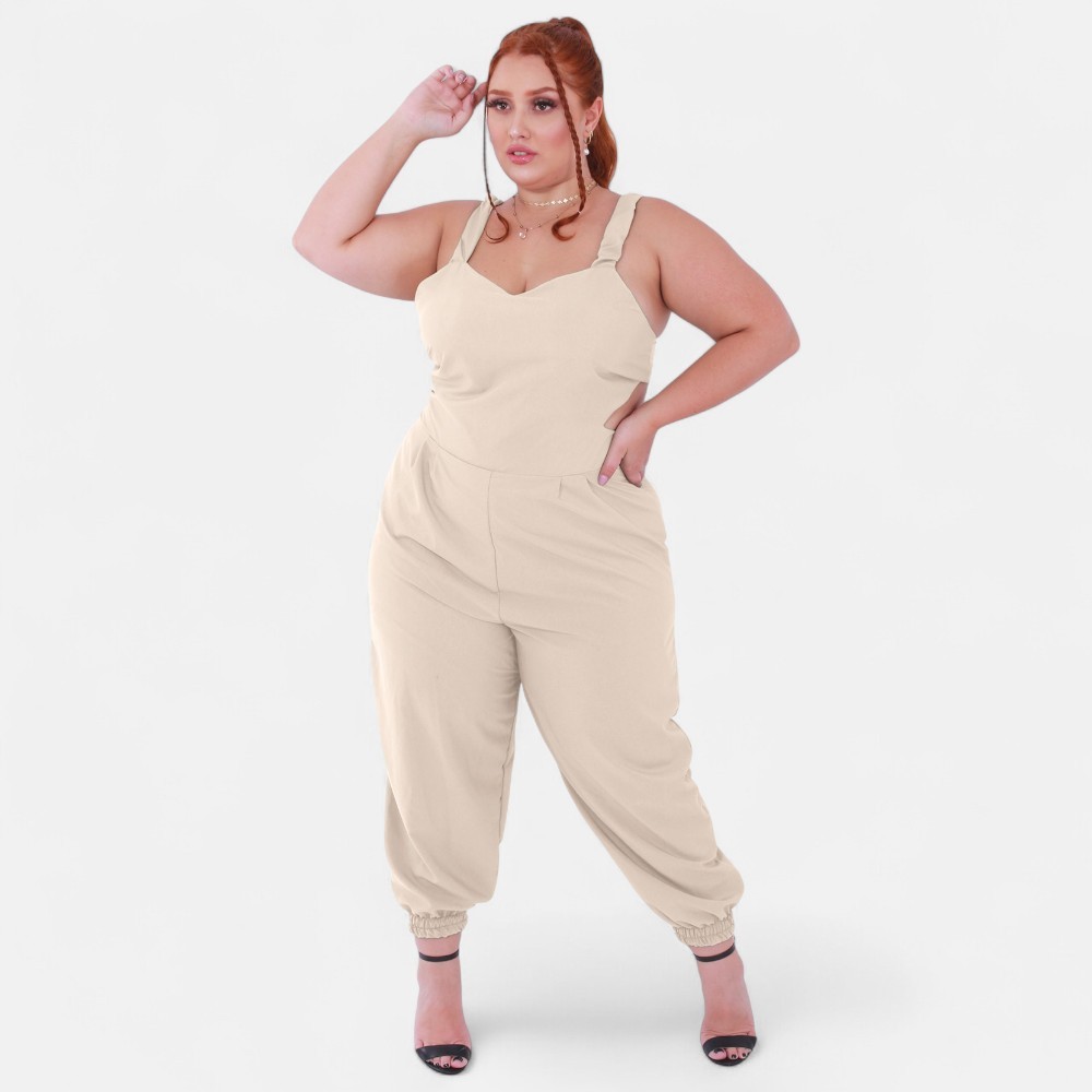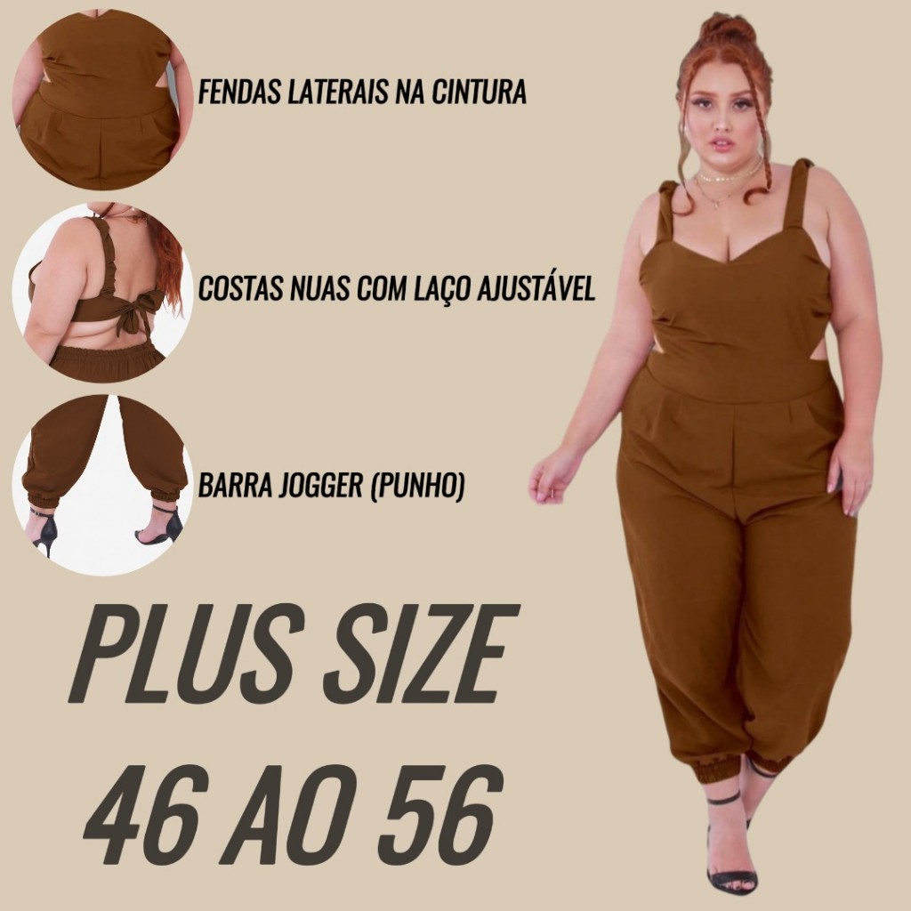 Macacao Plus Size Jogger Skinny Pantacourt Meia Canela Bojo Costa Nua Laço sem Bolsos Outono/Inverno
