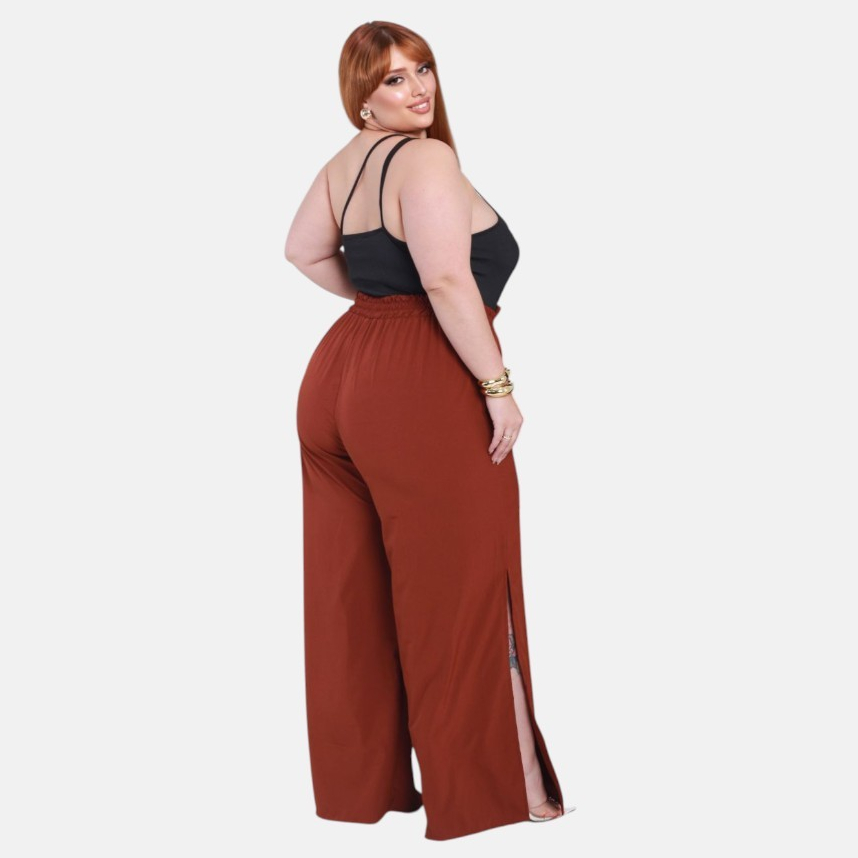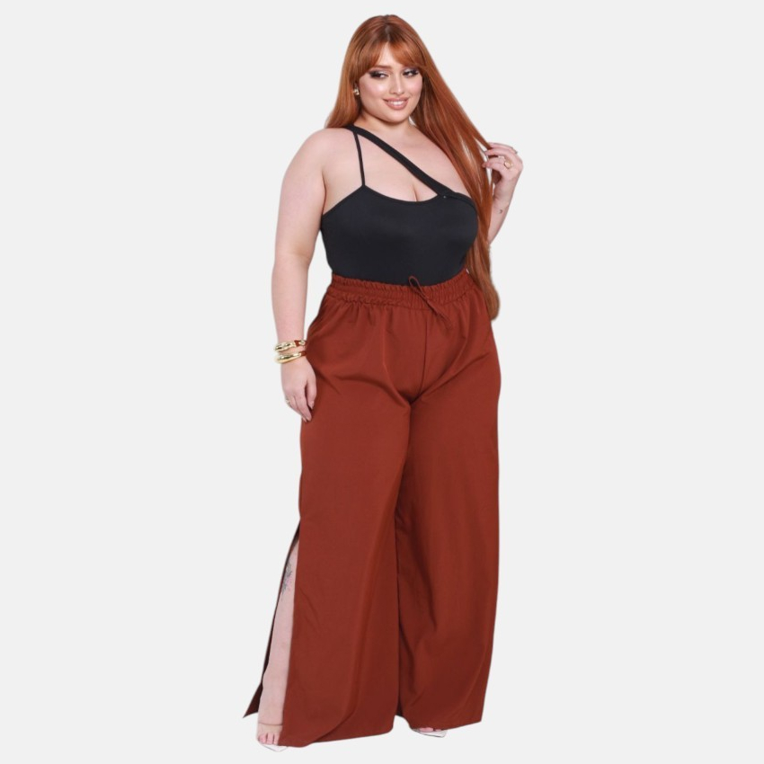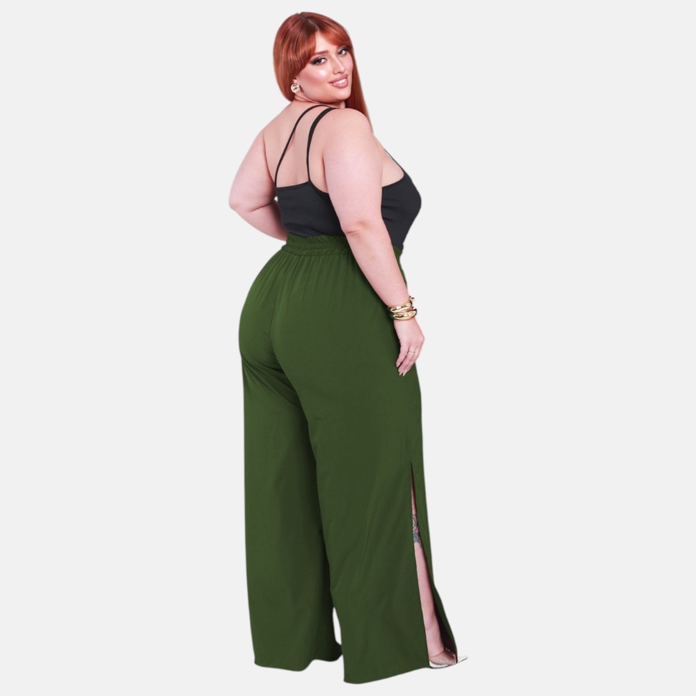 Calça Abertura Lateral Plus Size Moda Wide Legging Soltinha Crepe Liso Acinturado Social