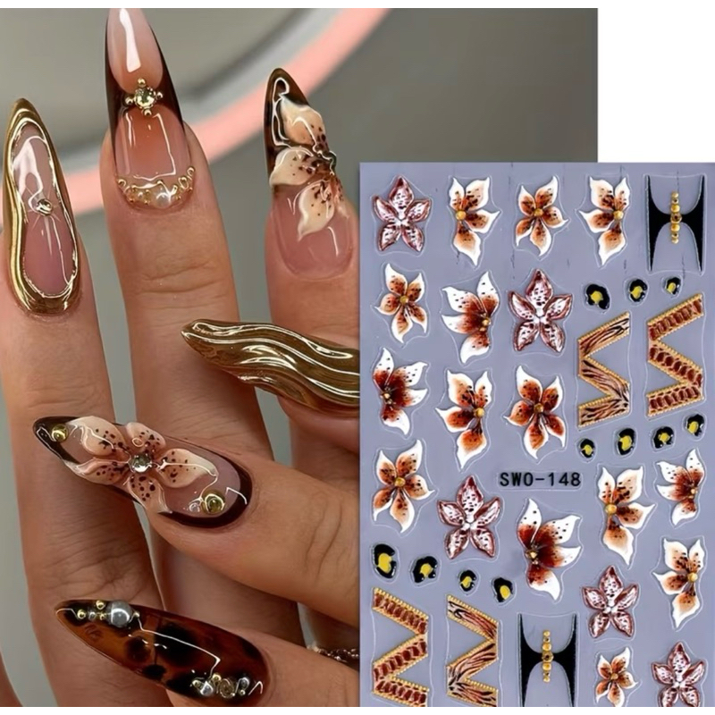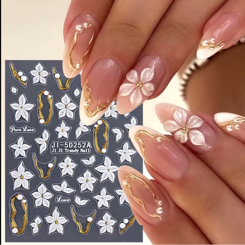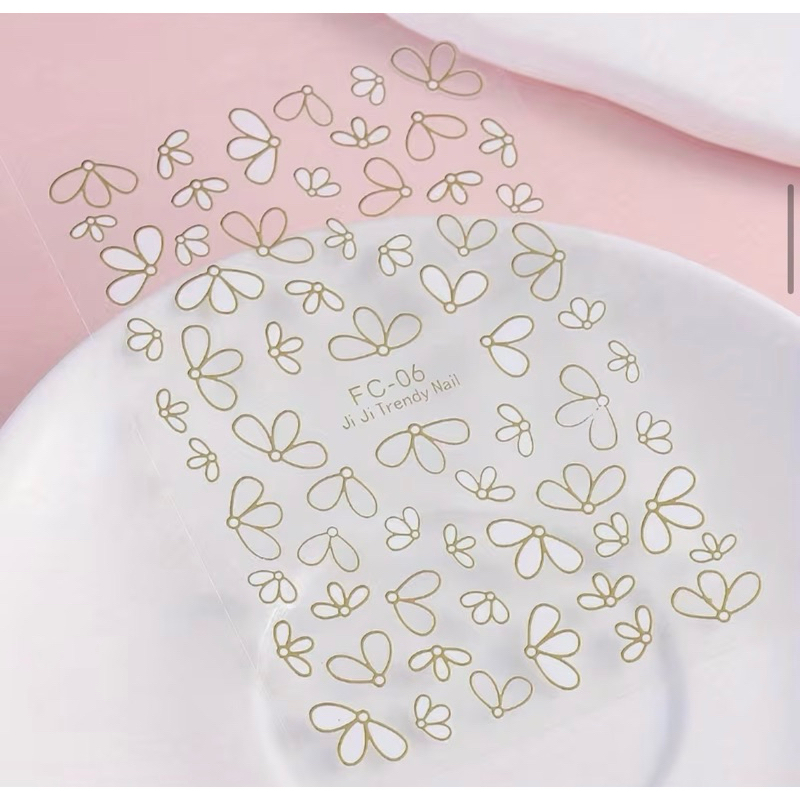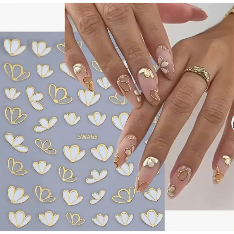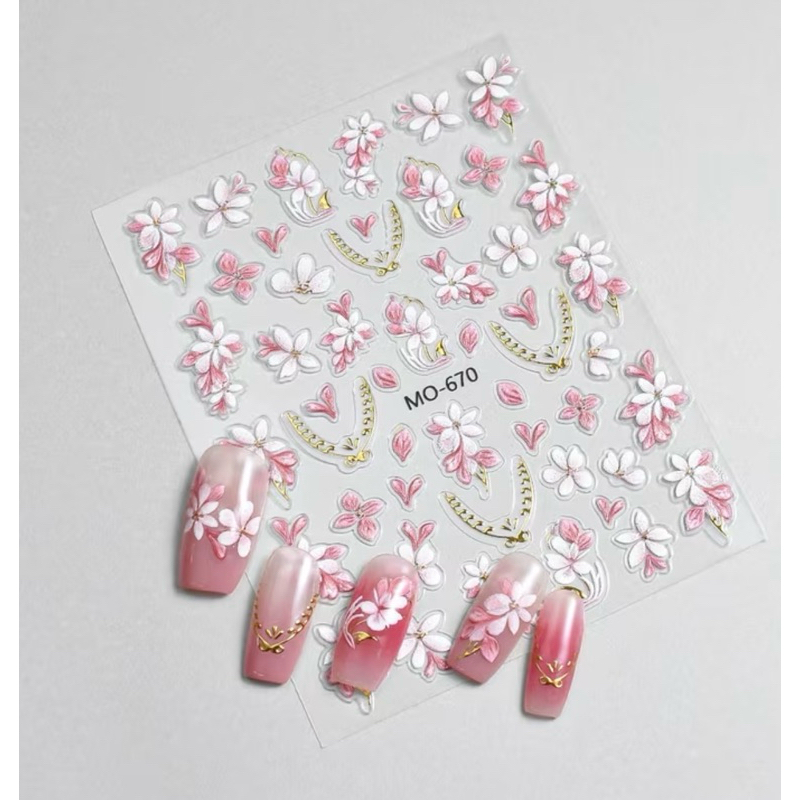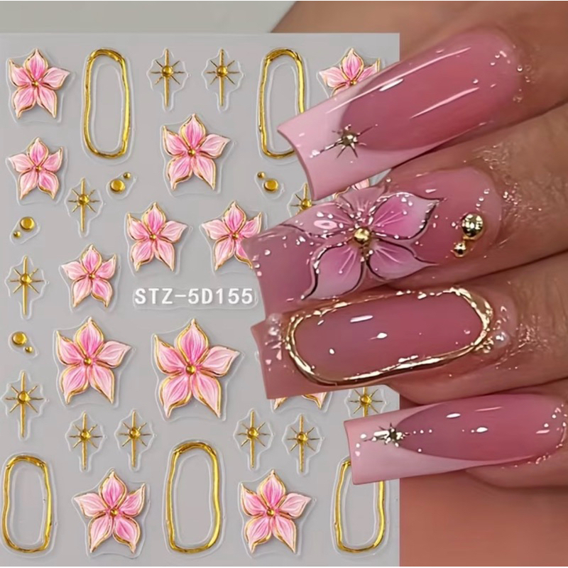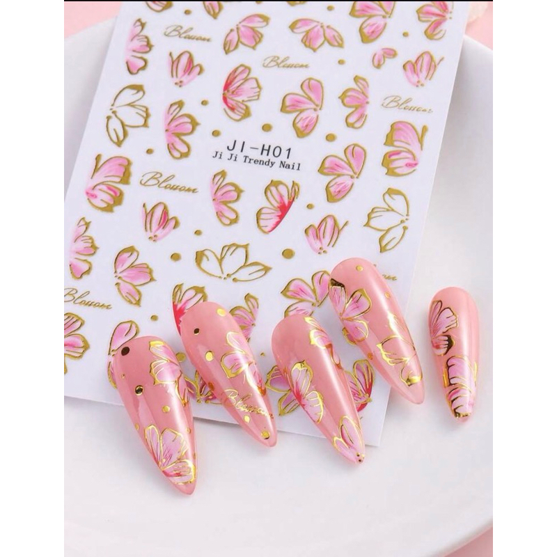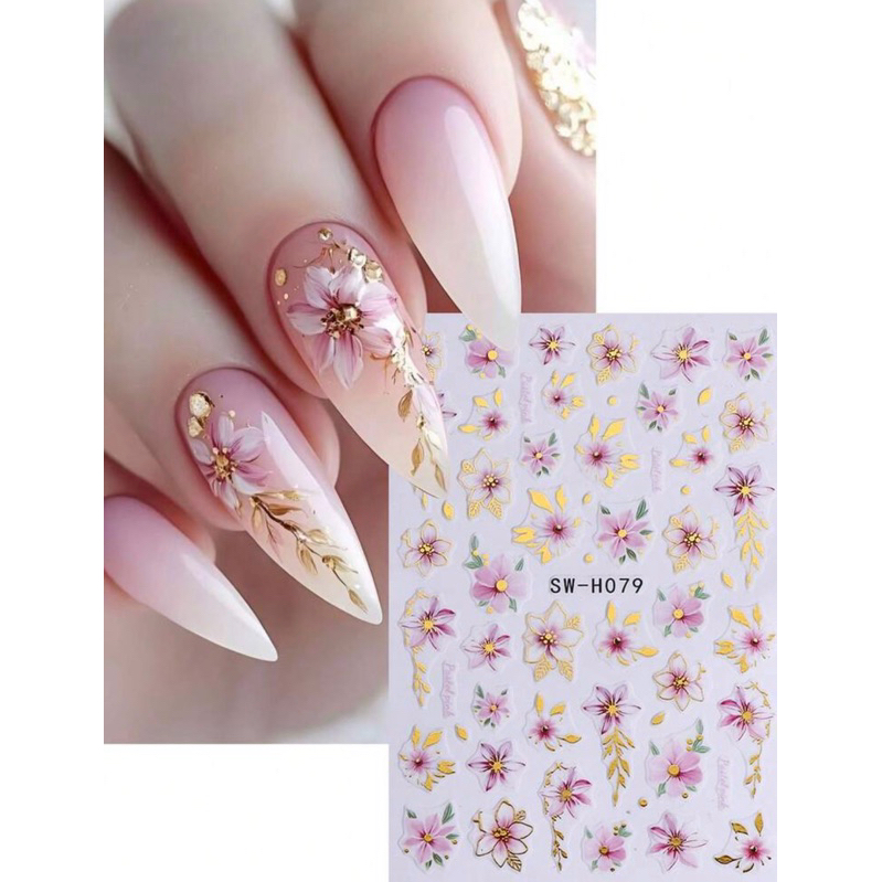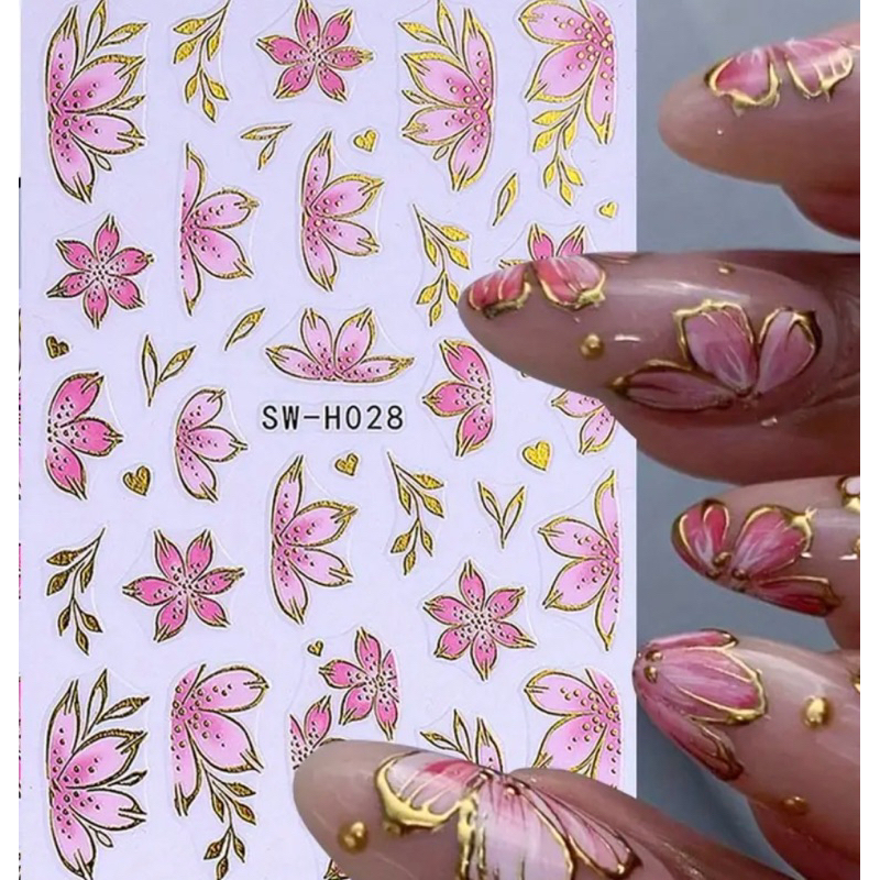 Uma Cartela De Adesivos de Unhas Flores Rosas com Detalhes Dourados | Nail Art Autocolante Y2K - ENVIO RÁPIDO