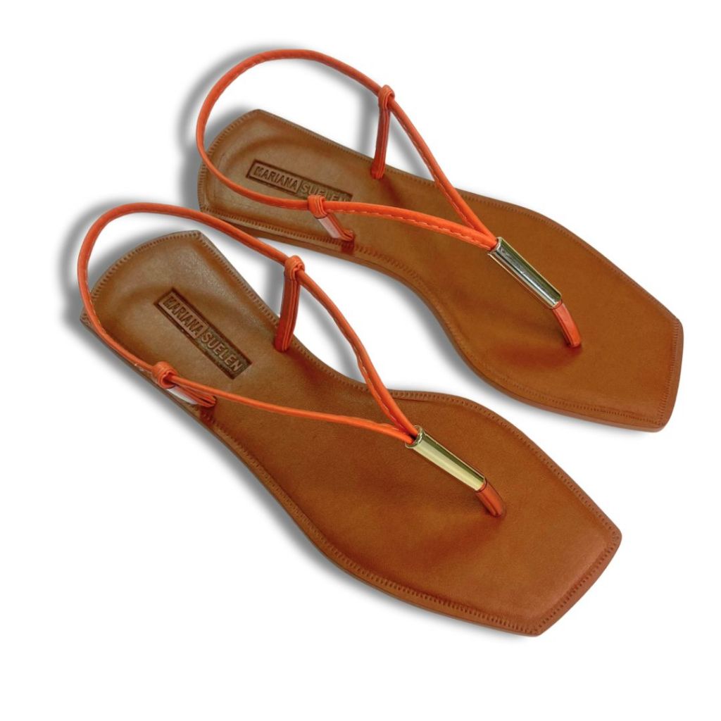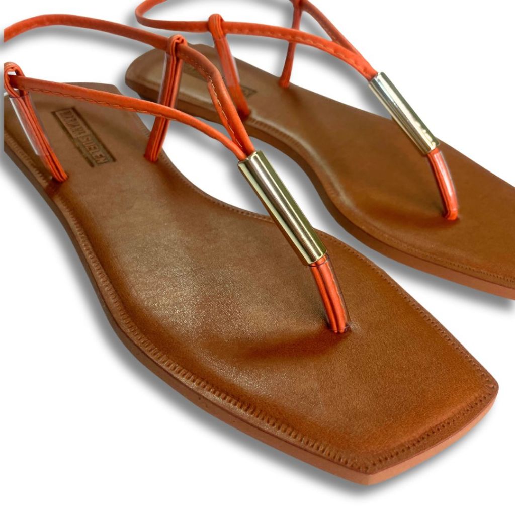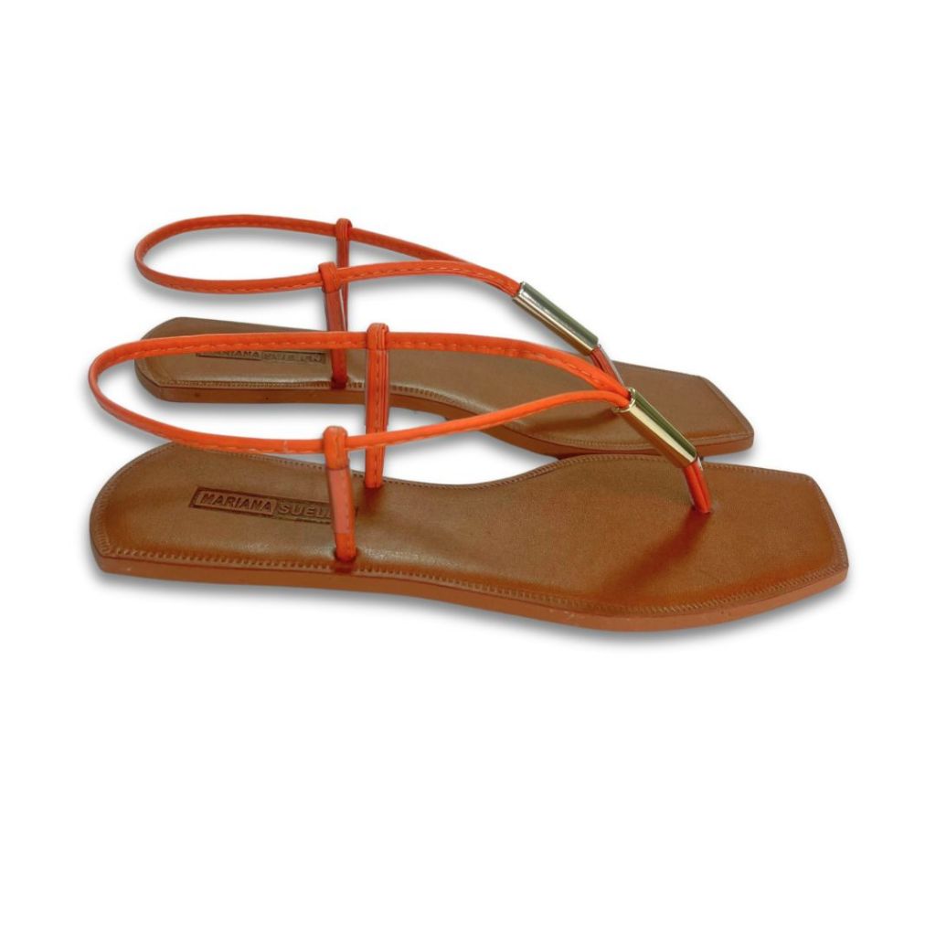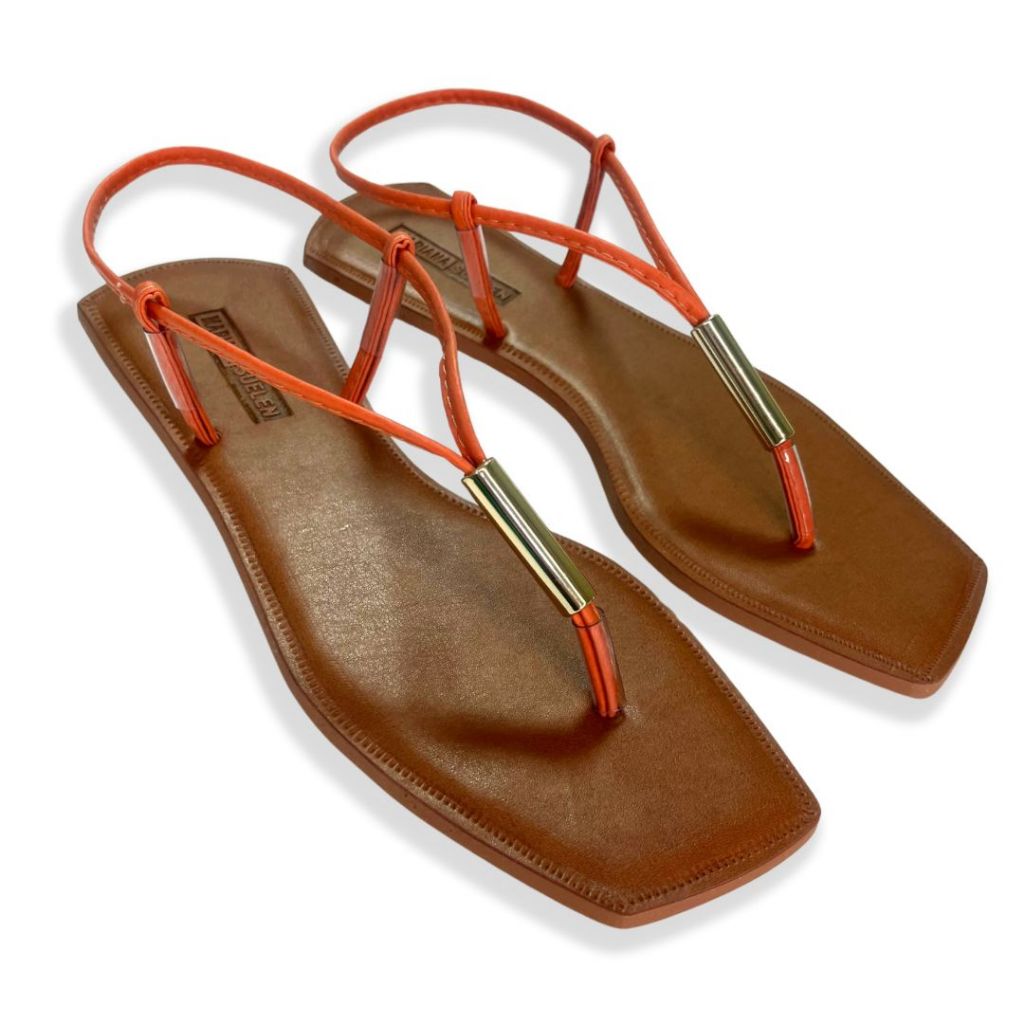 Sandália rasteira feminina com tira fina laranja entre os dedos detalhe em peça metálica 015