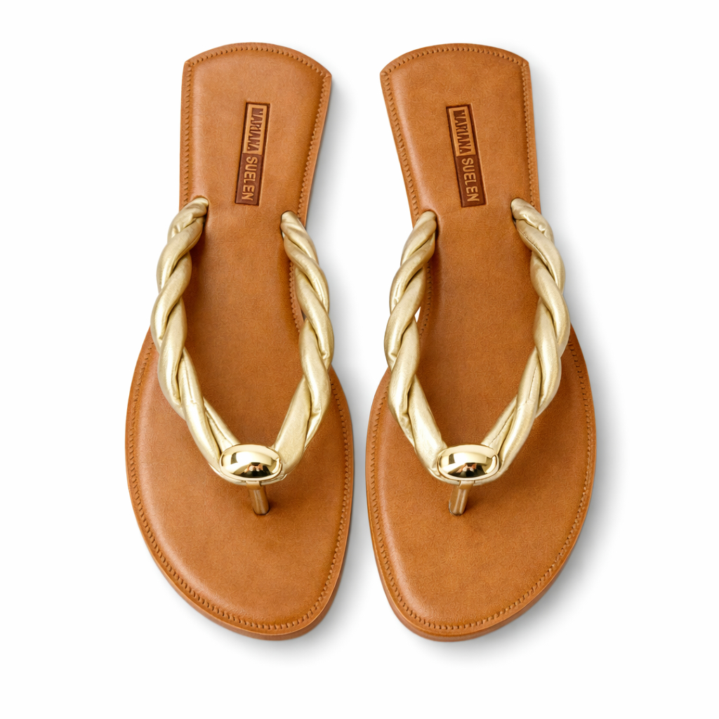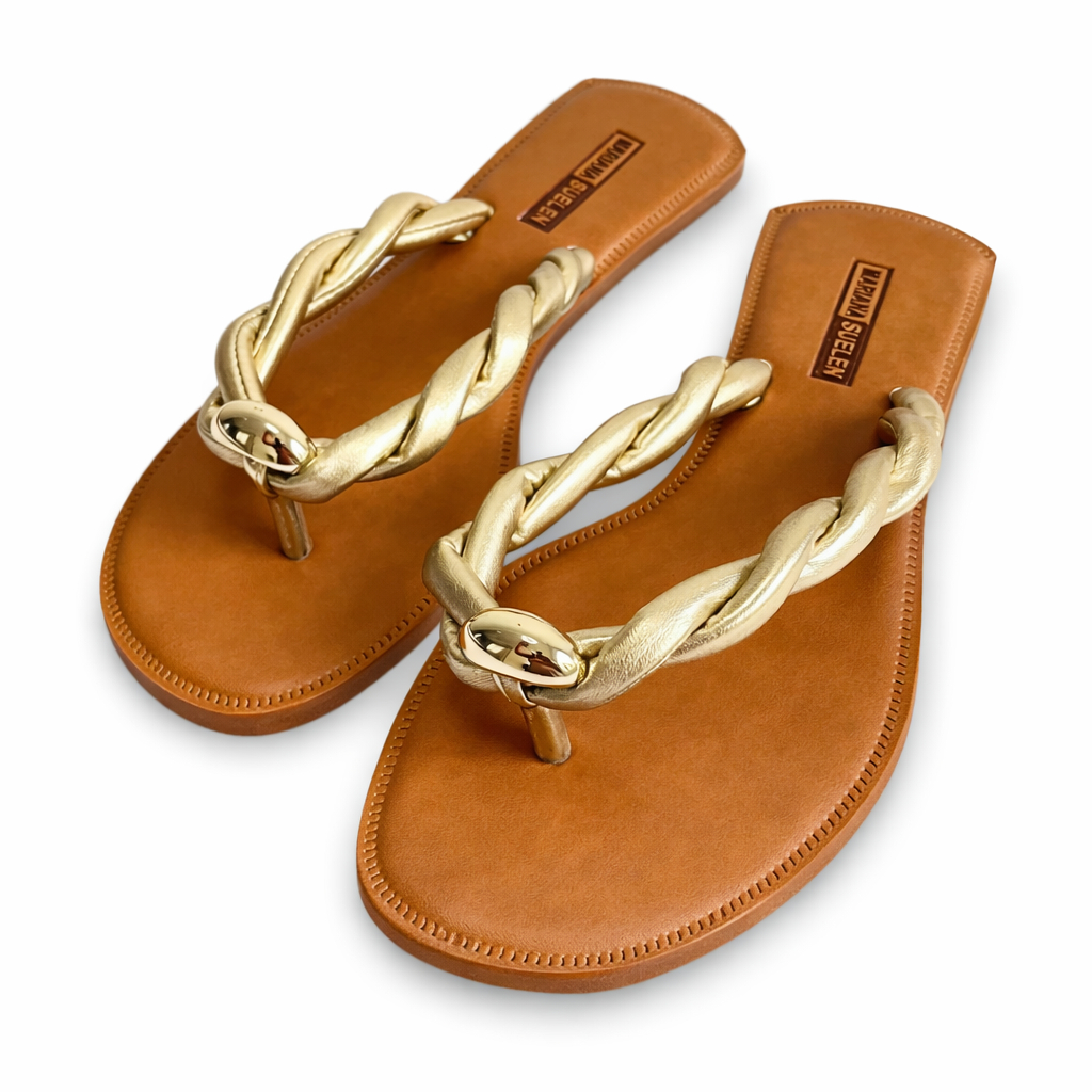 Sandália Rasteirinha Feminina Chinelo dourada tiras trançada e peça de metal 213