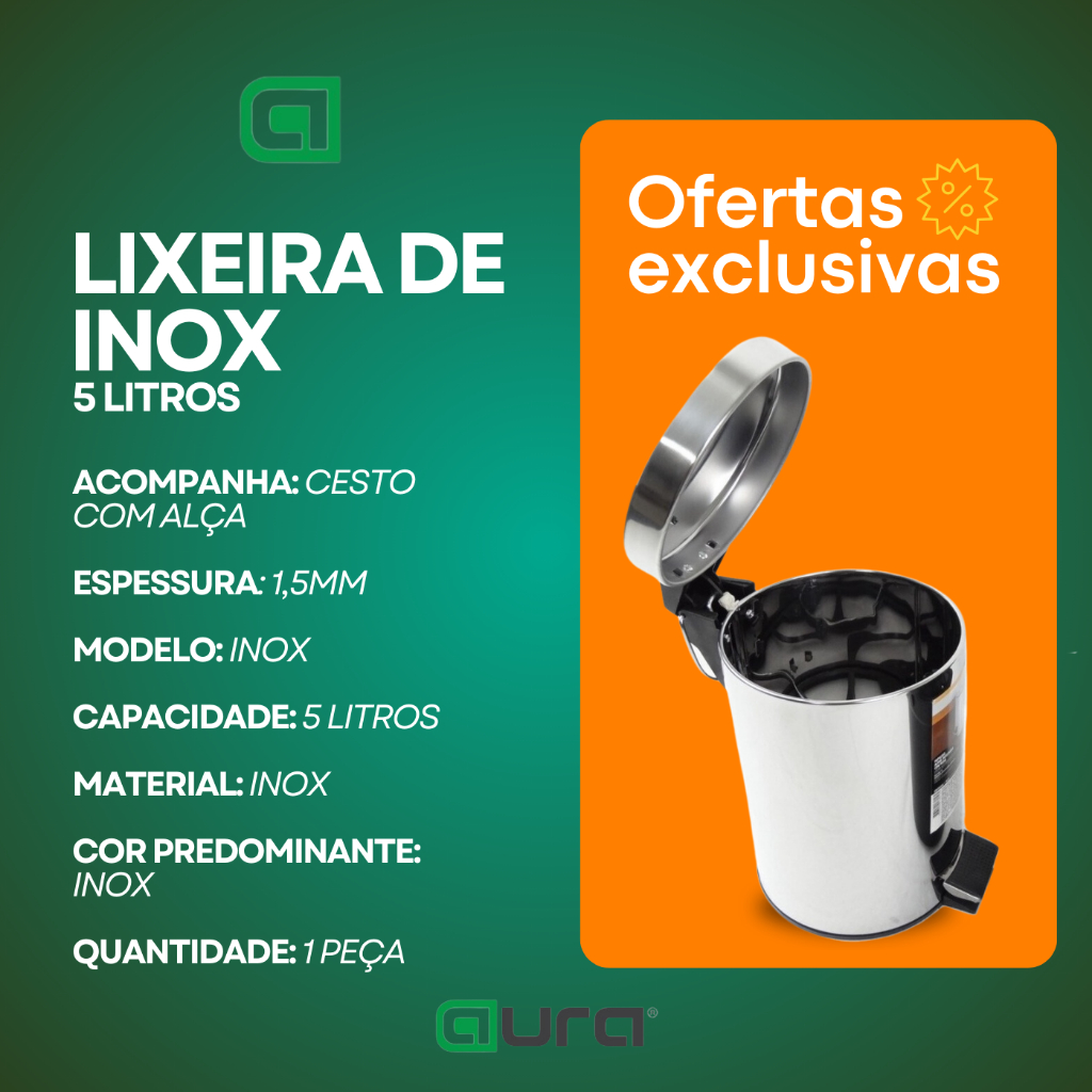 Lixeira Inox Aço 5 litros C/ Pedal Cesto Interno Removivel Banheiro Cozinha