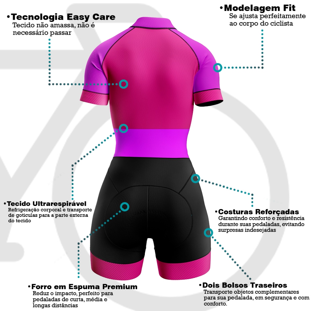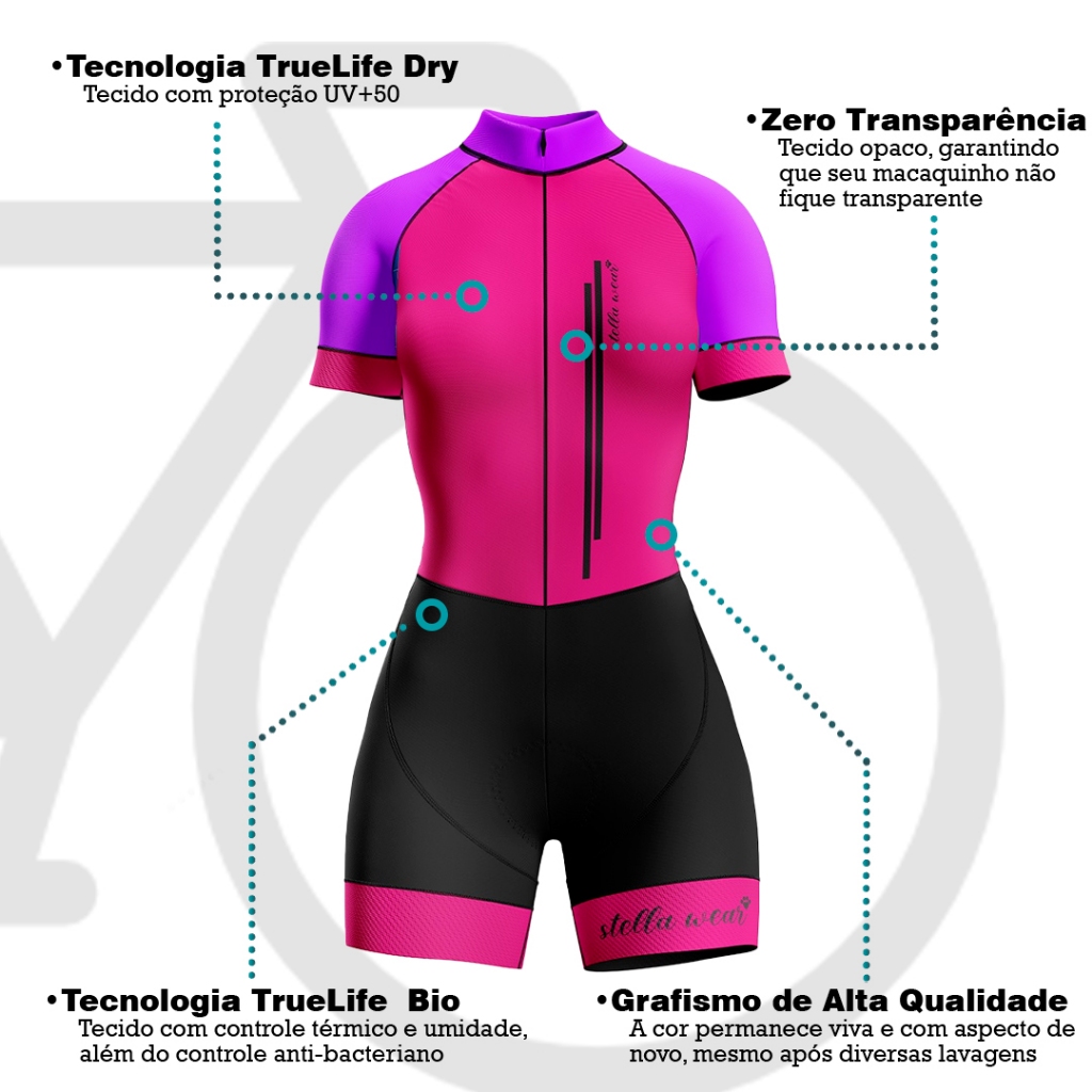 Macaquinho Ciclismo Feminino Profissional Gel Acolchoado UV Proteção MTB Speed Rosa Stella Wear