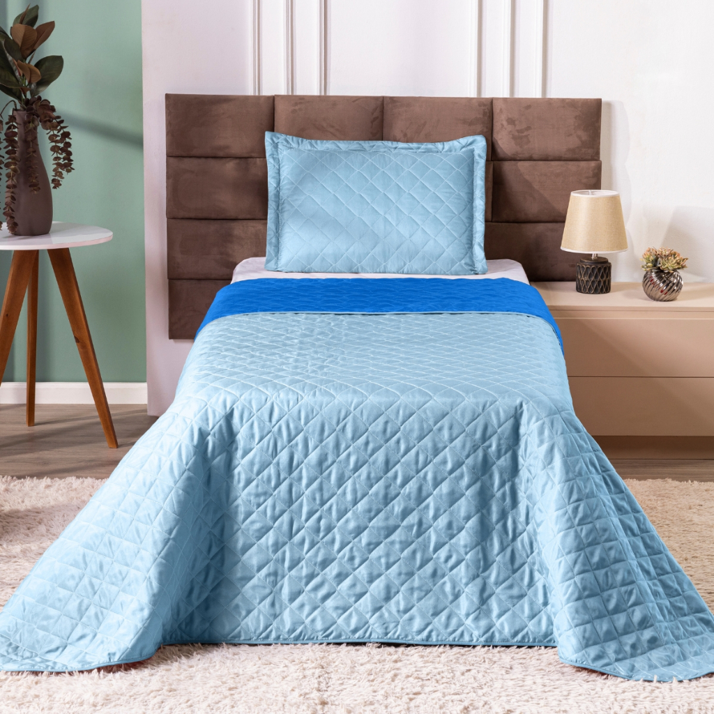 Kit colcha cobre leito Solteiro com viés dupla face menino 2 peças azul royal/azul claro