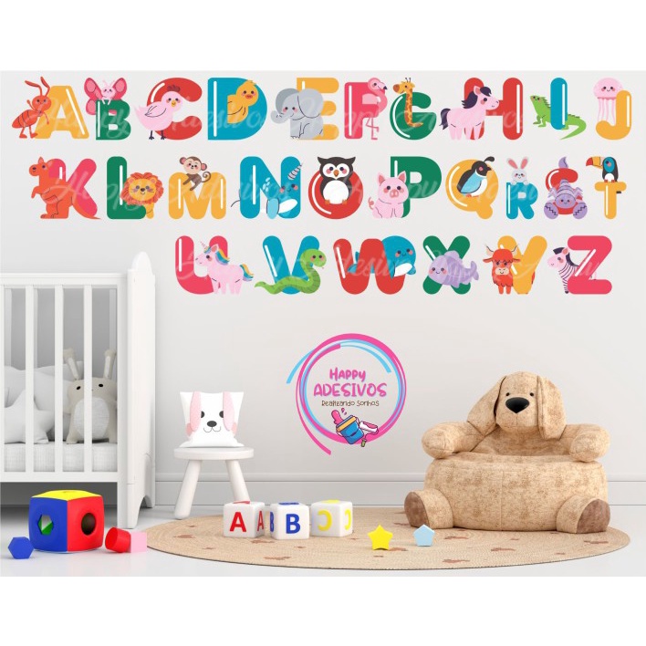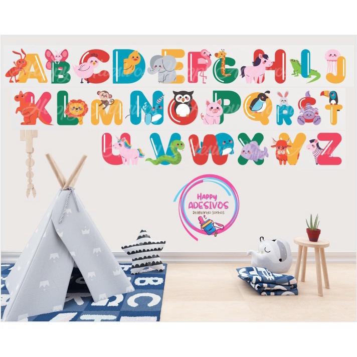 Adesivo de Parede Alfabeto com Animais Infantil Zoo Selva Safari Colorido Abecedário Alfabetização