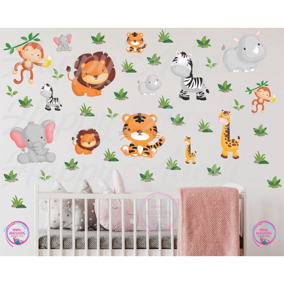 Kit de 43 Adesivos de Recorte Animais Safari + Plantinhas Adesivo Parede Decoração Quarto Infantil