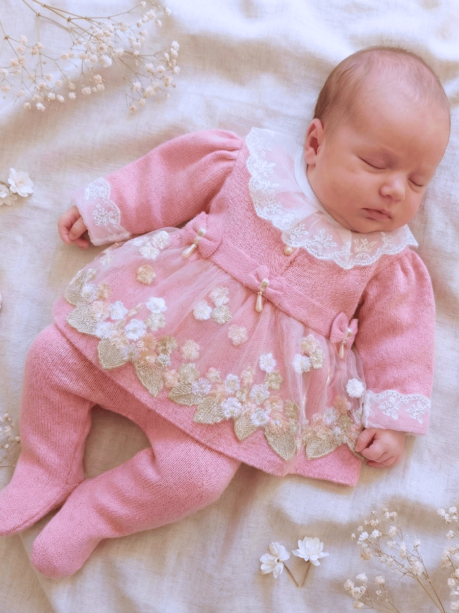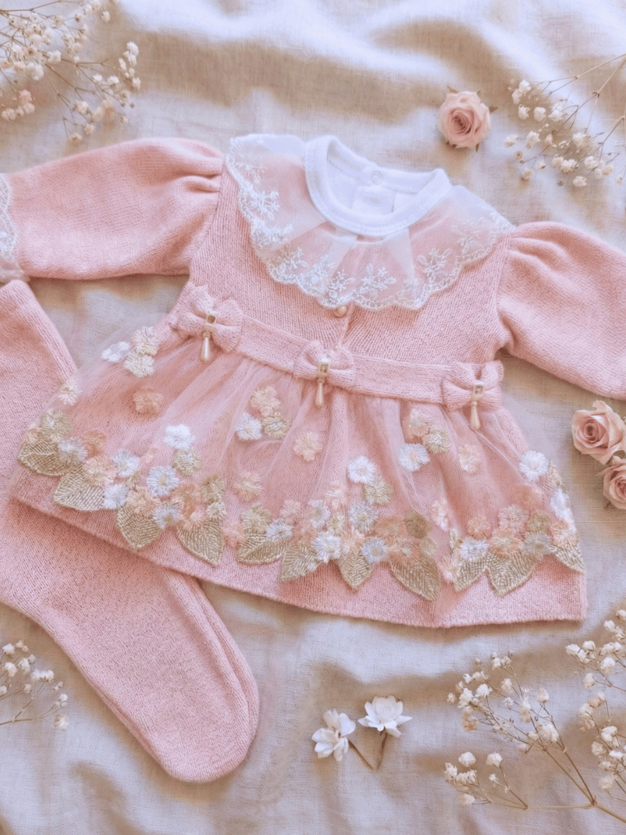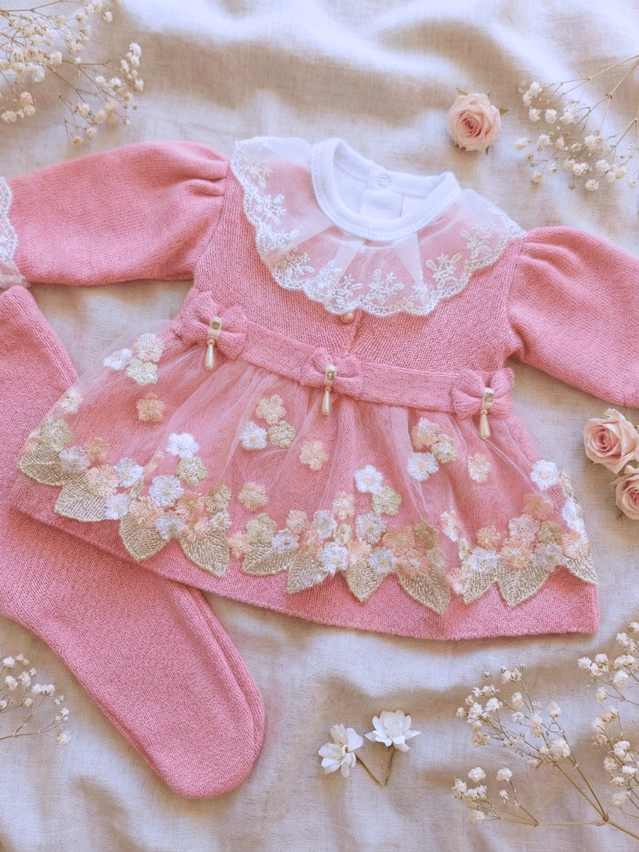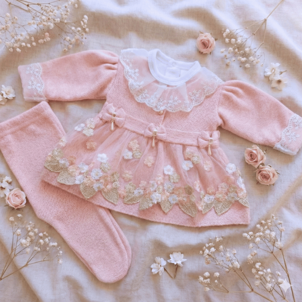 Kit Saida de Maternidade Menina Vestido Tricot Recem Nascido 3 Peças 0 a 1 mês