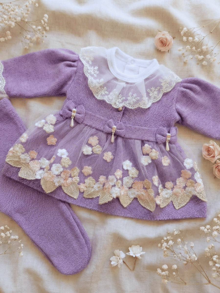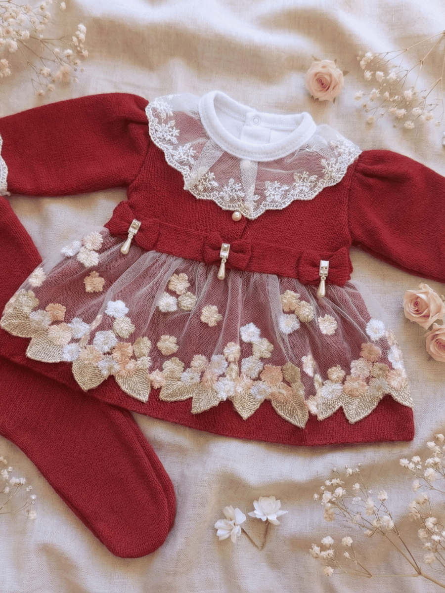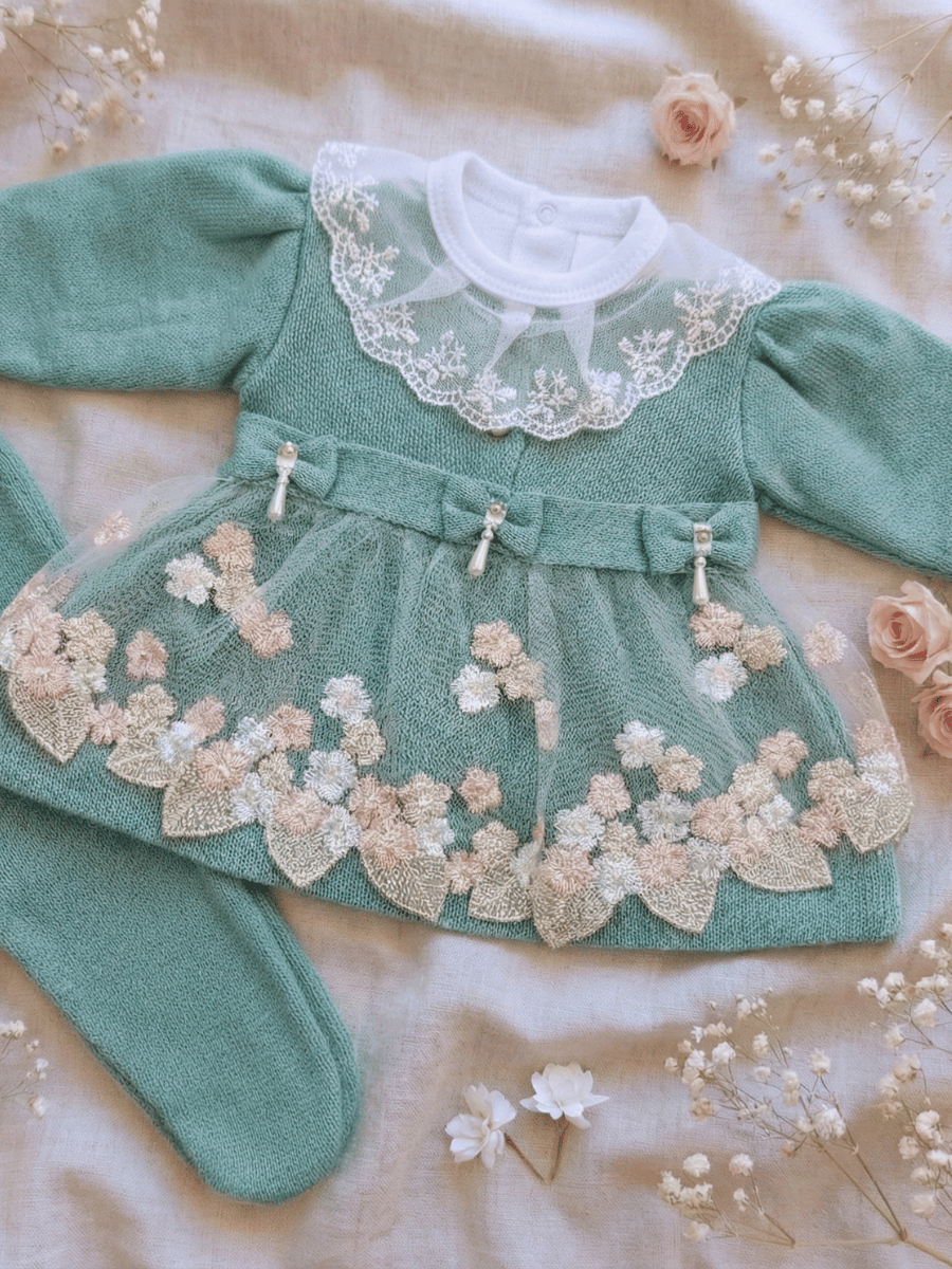 Kit Saida de Maternidade Menina Vestido Tricot Recem Nascido 3 Peças 0 a 1 mês