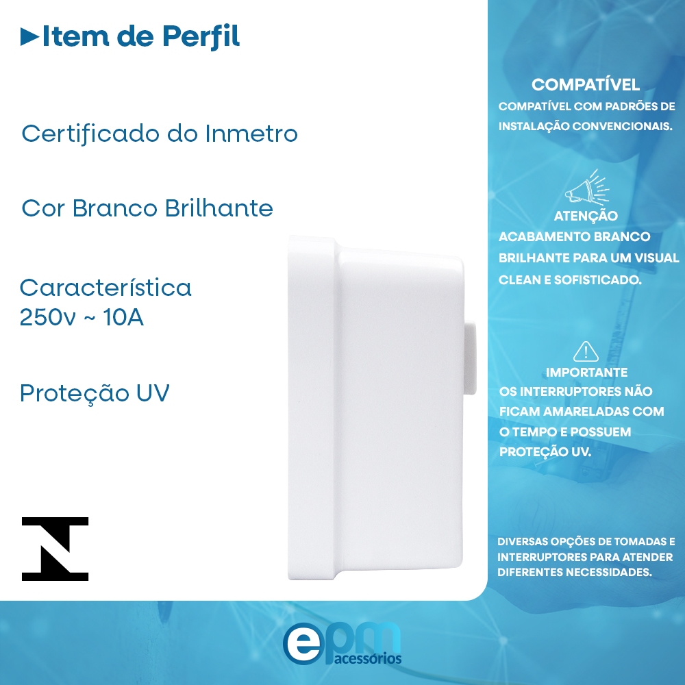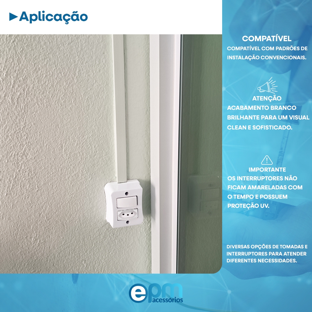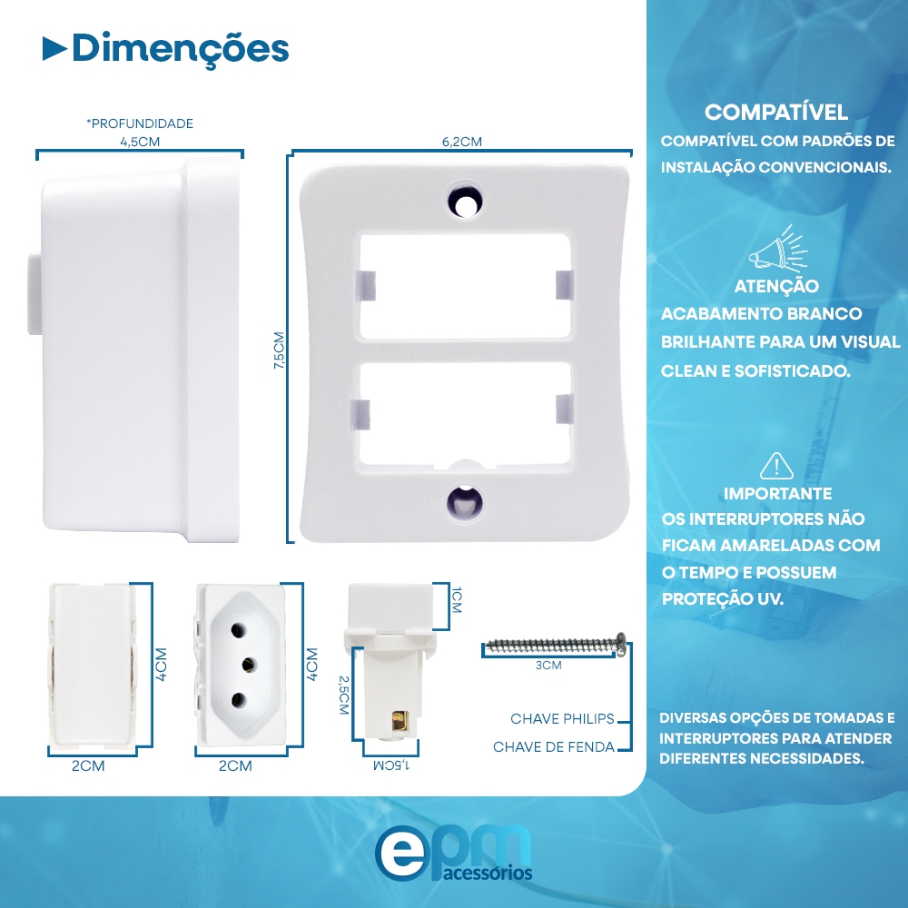 Kit 5 Interruptor Simples 1 Tecla + Tomada 10A 2p+t Sobrepor Espelho Branco Linha Viena 127v e 250v